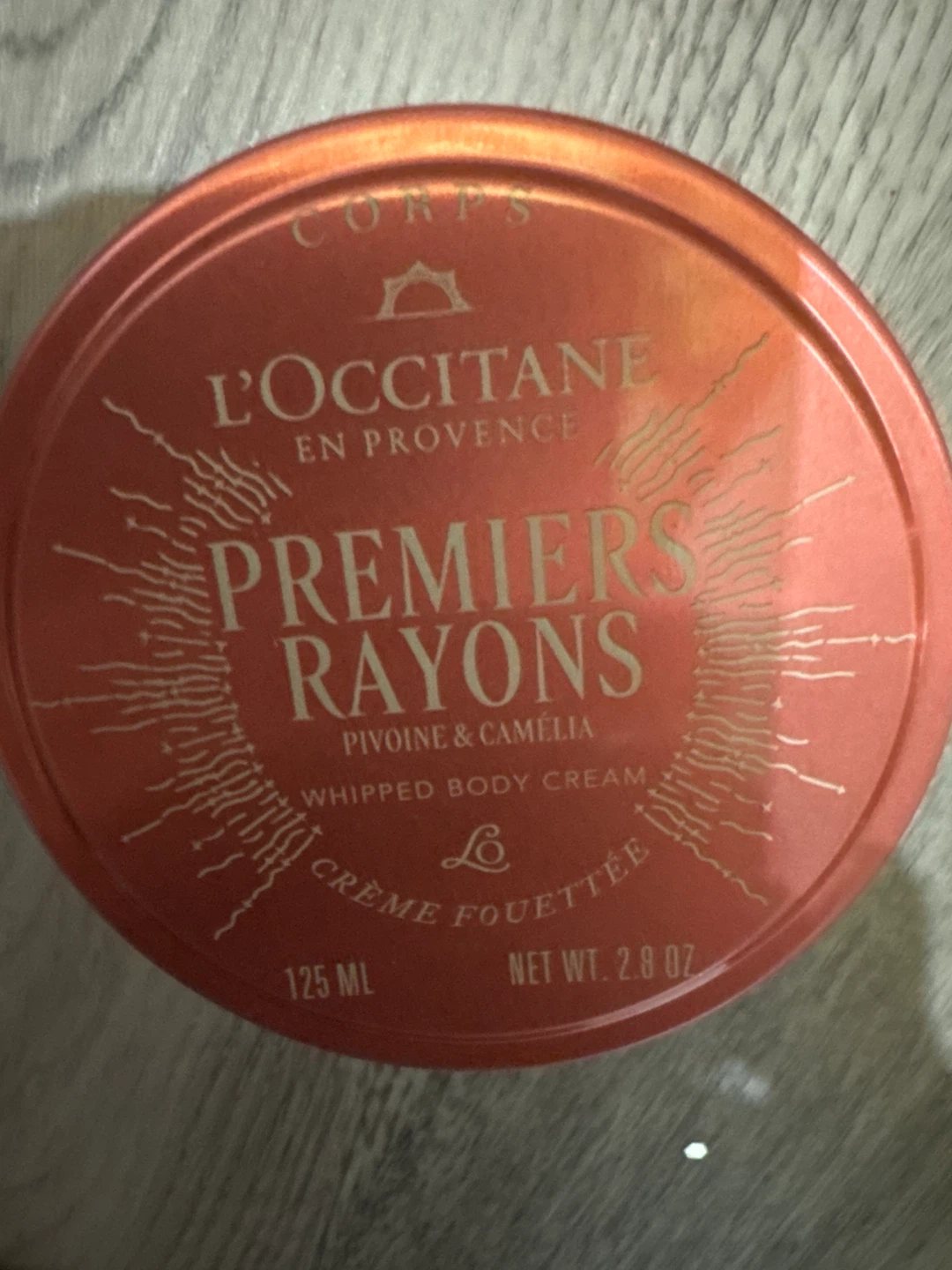 L'Occitane en Provence Premiers Rayons whipped body cream. It's a pivoine & camélia scent. 125 ML net wt. 2.8 OZ.