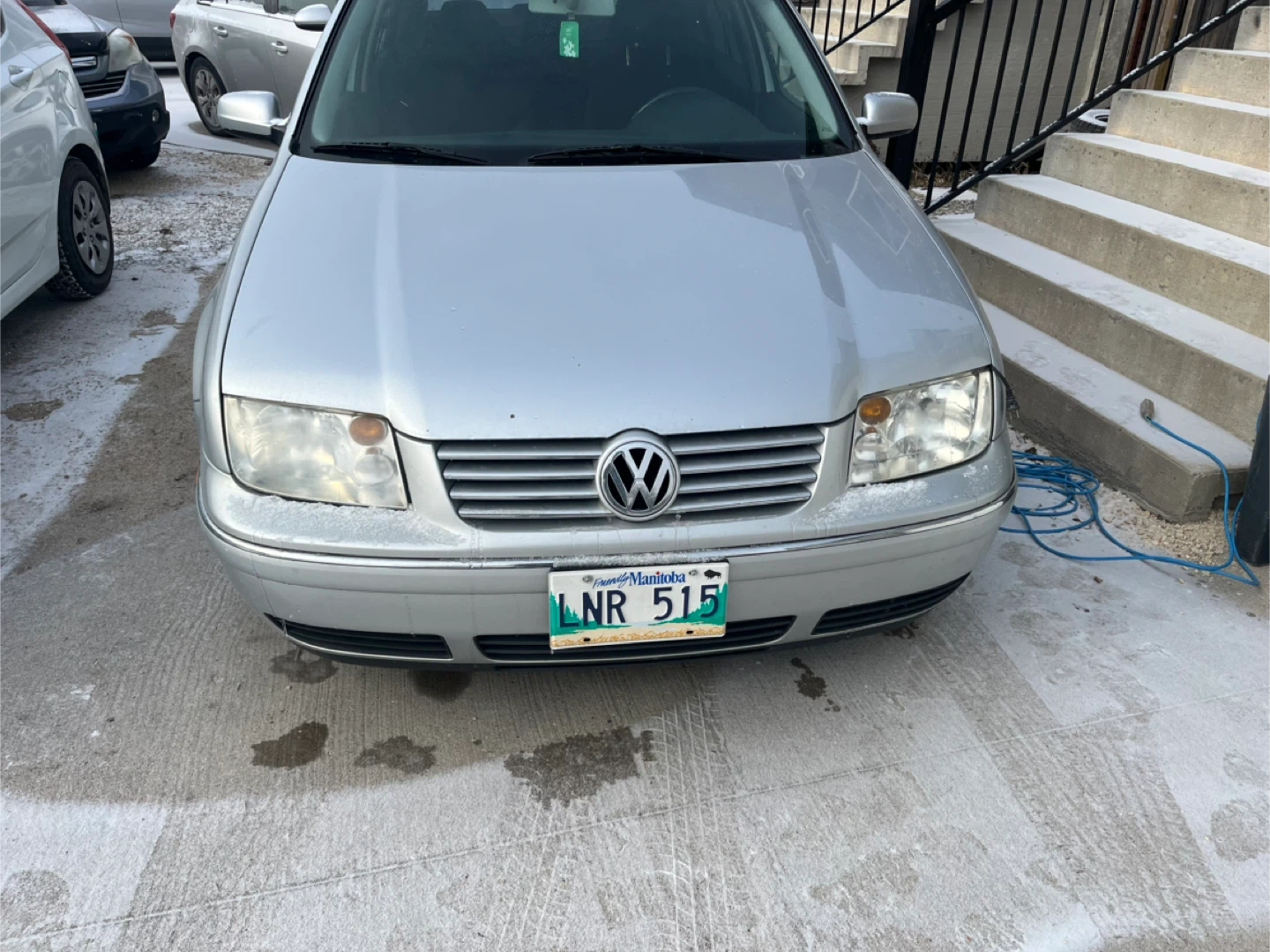 This is a white Hyundai Accent hatchback. It's a four-door car with a 5-speed manual transmission. It runs well and has low mileage for its age.