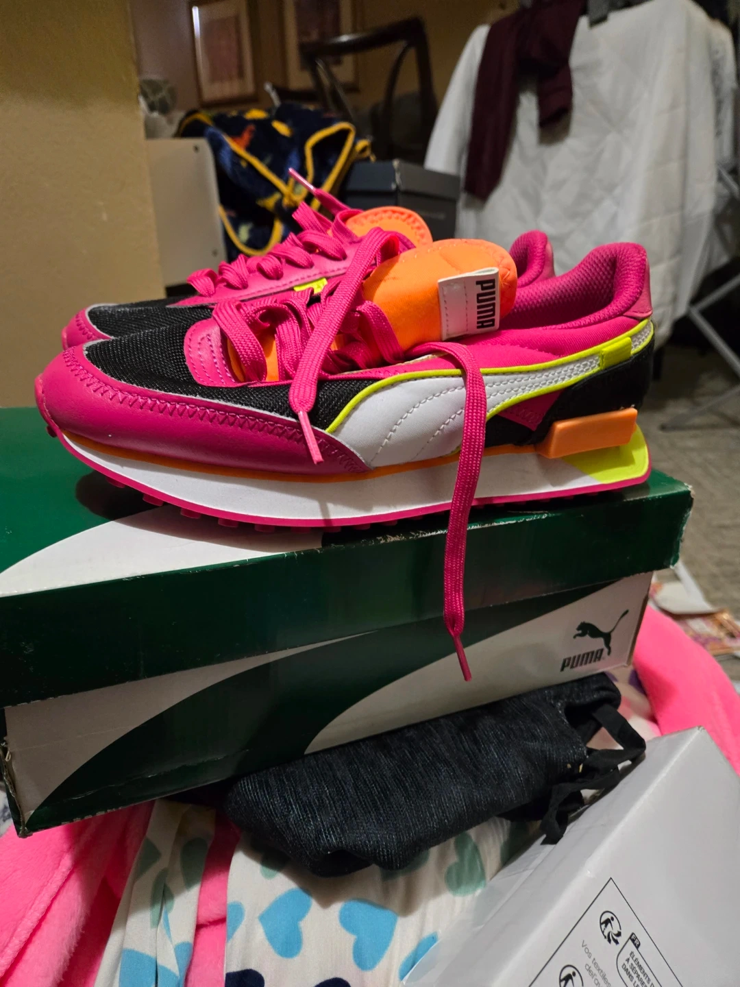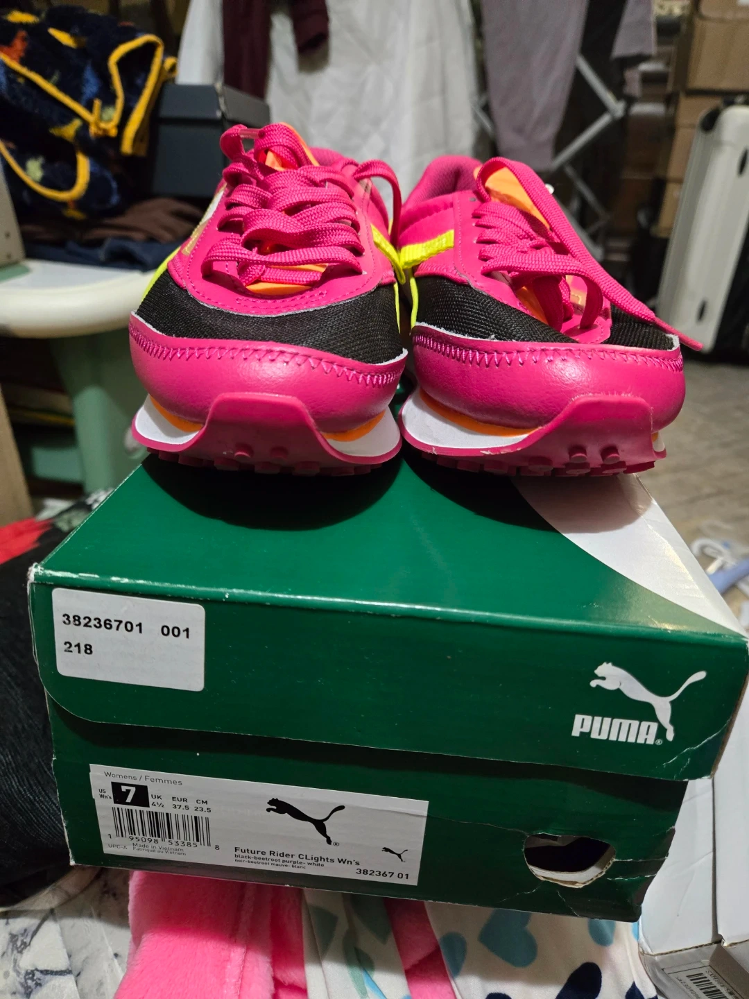 Bright pink Puma Future Rider CLights sneakers. Features a mix of mesh and synthetic materials. Lace-up closure for a secure fit. Women's US size 7.