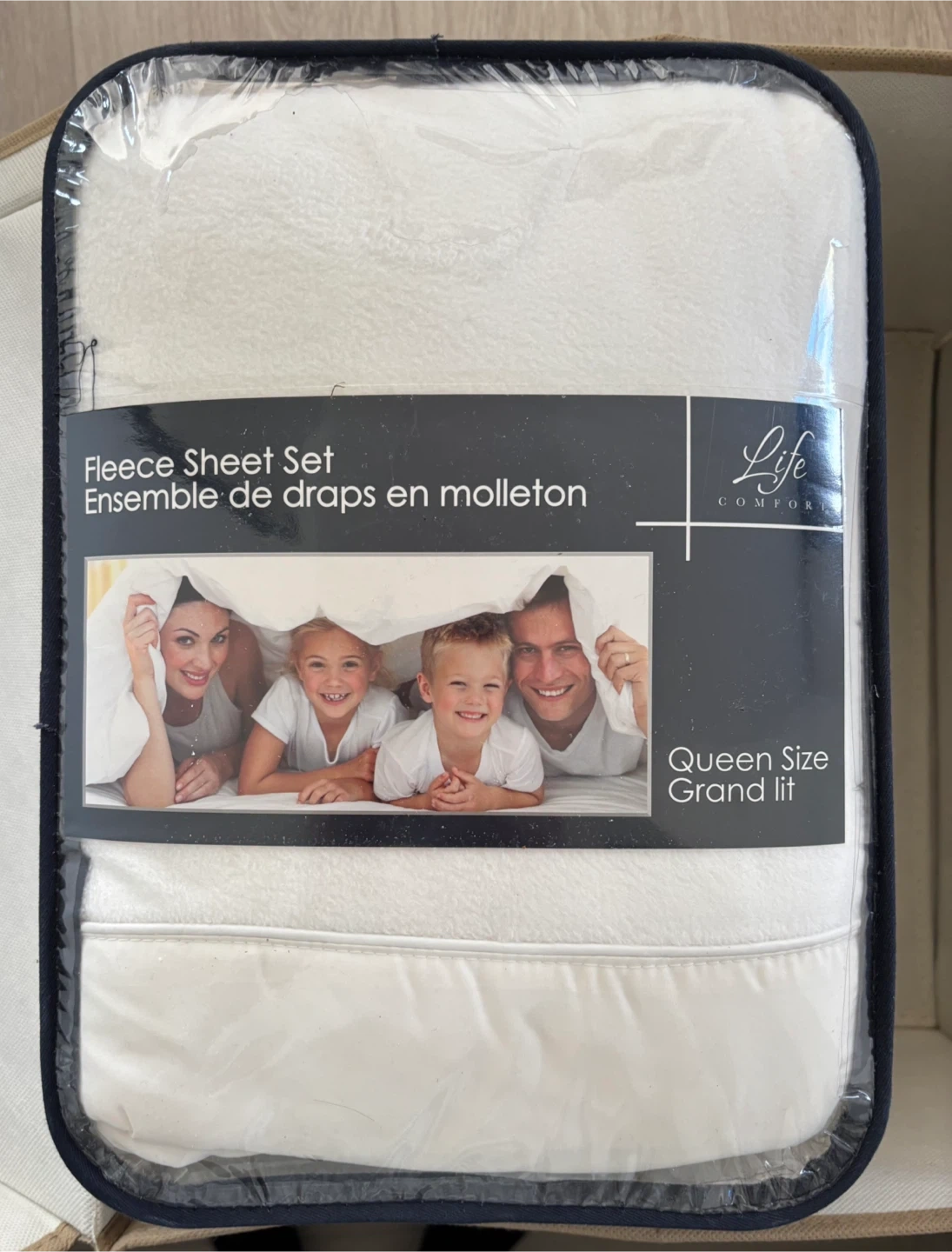 This is a brand new Queen Size fleece sheet set from Life Comfort. It's made of 100% polyester for ultimate softness. The set includes a flat sheet measuring 90" x 100", a fitted sheet measuring 60" x 80" with a 15" deep pocket, and two queen-size pillowcases measuring 20" x 32".