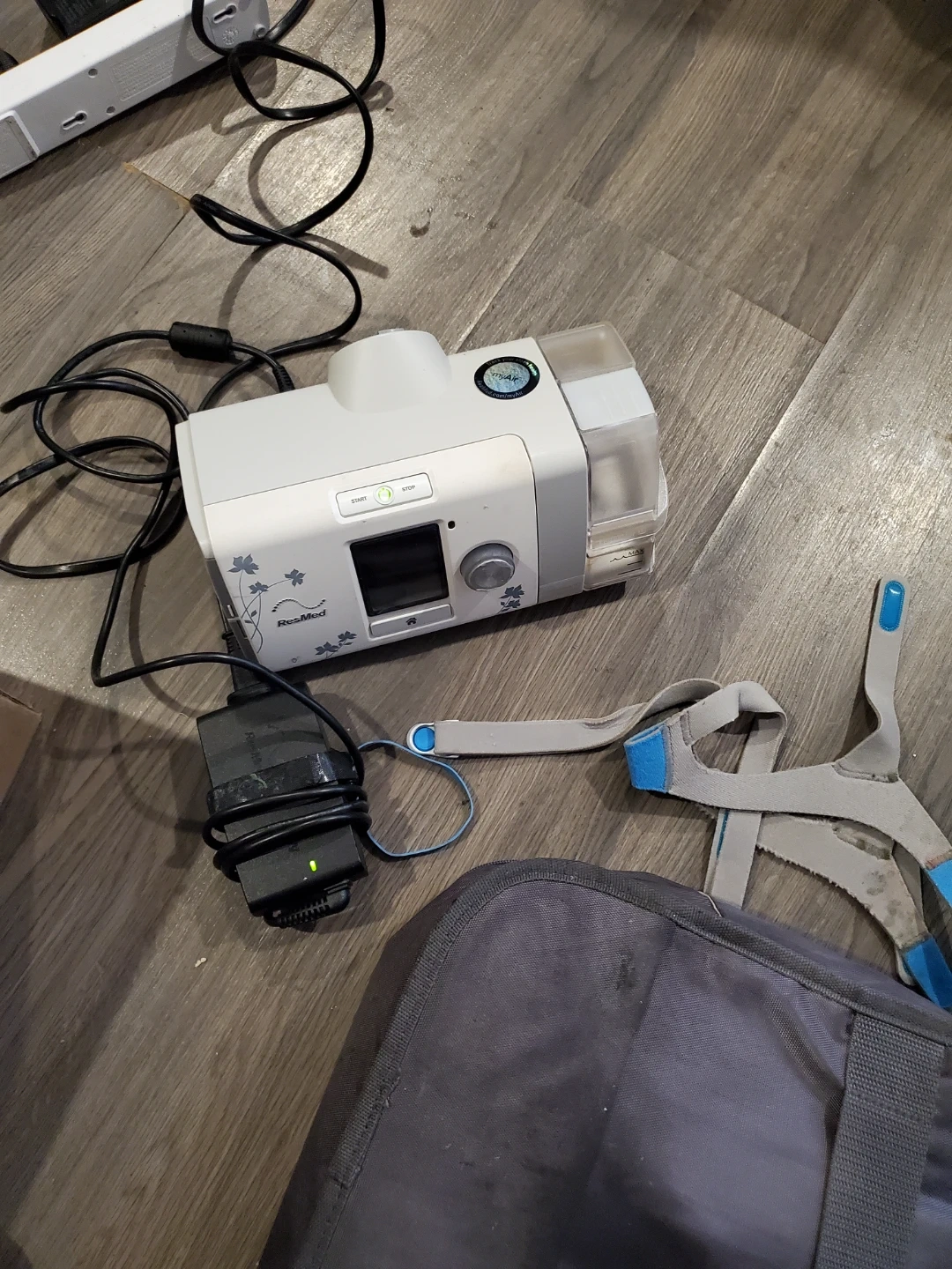 ResMed AirSense 10 CPAP machine and humidifier included. It comes with a power adapter and a CPAP mask. The humidifier chamber is detachable. The machine has a display screen and controls for settings.