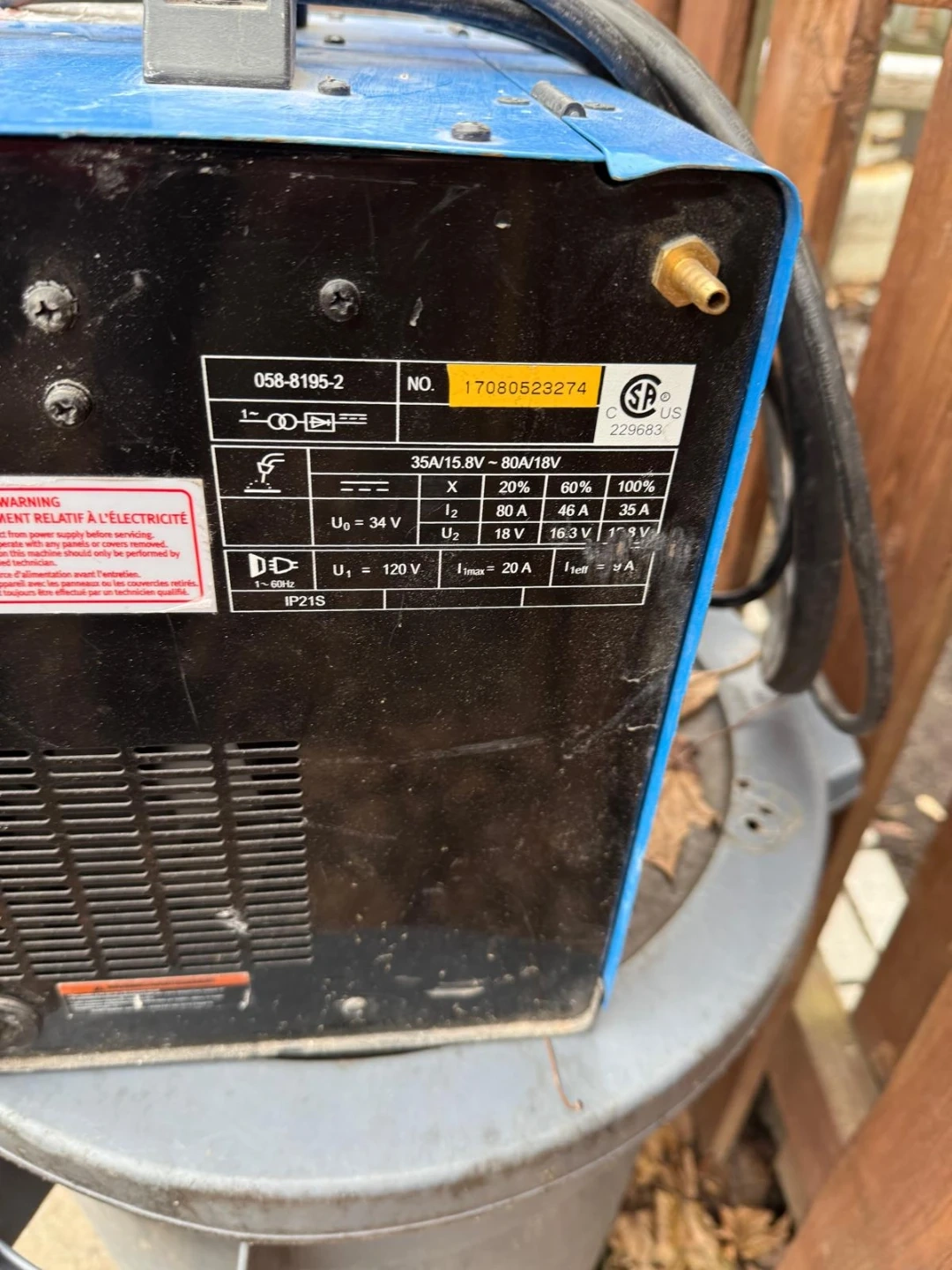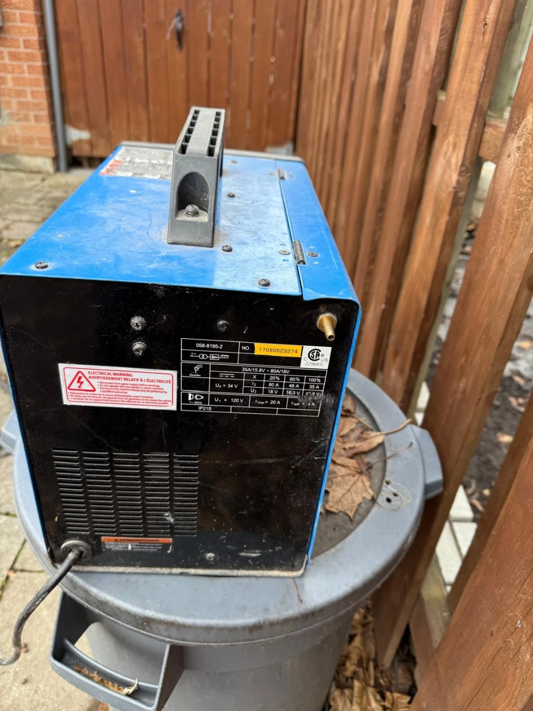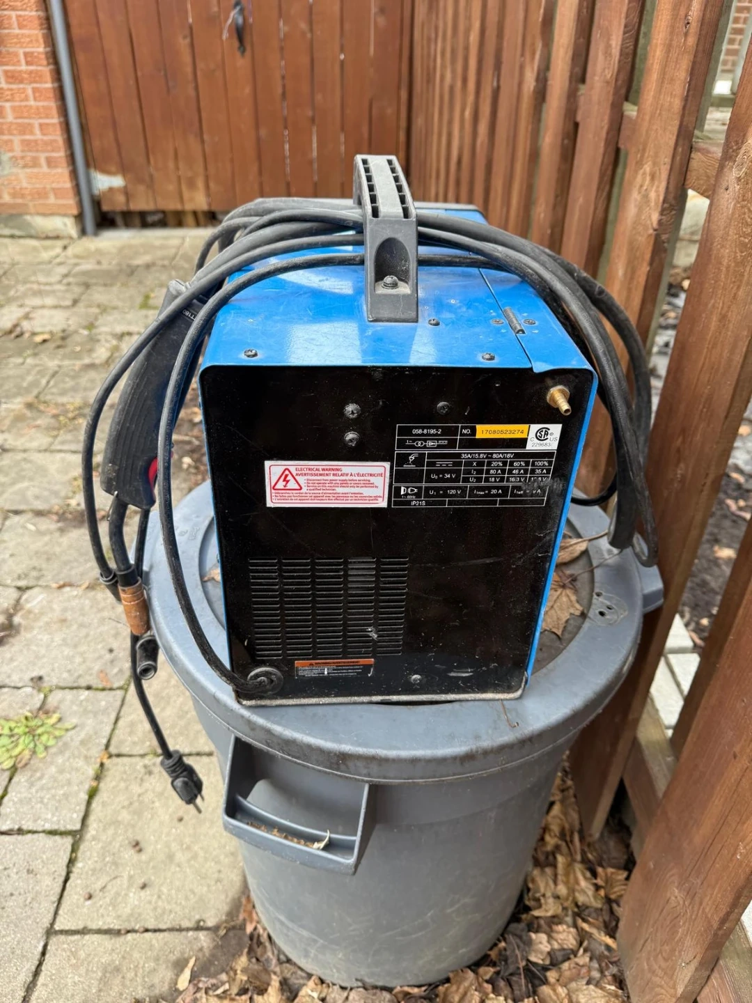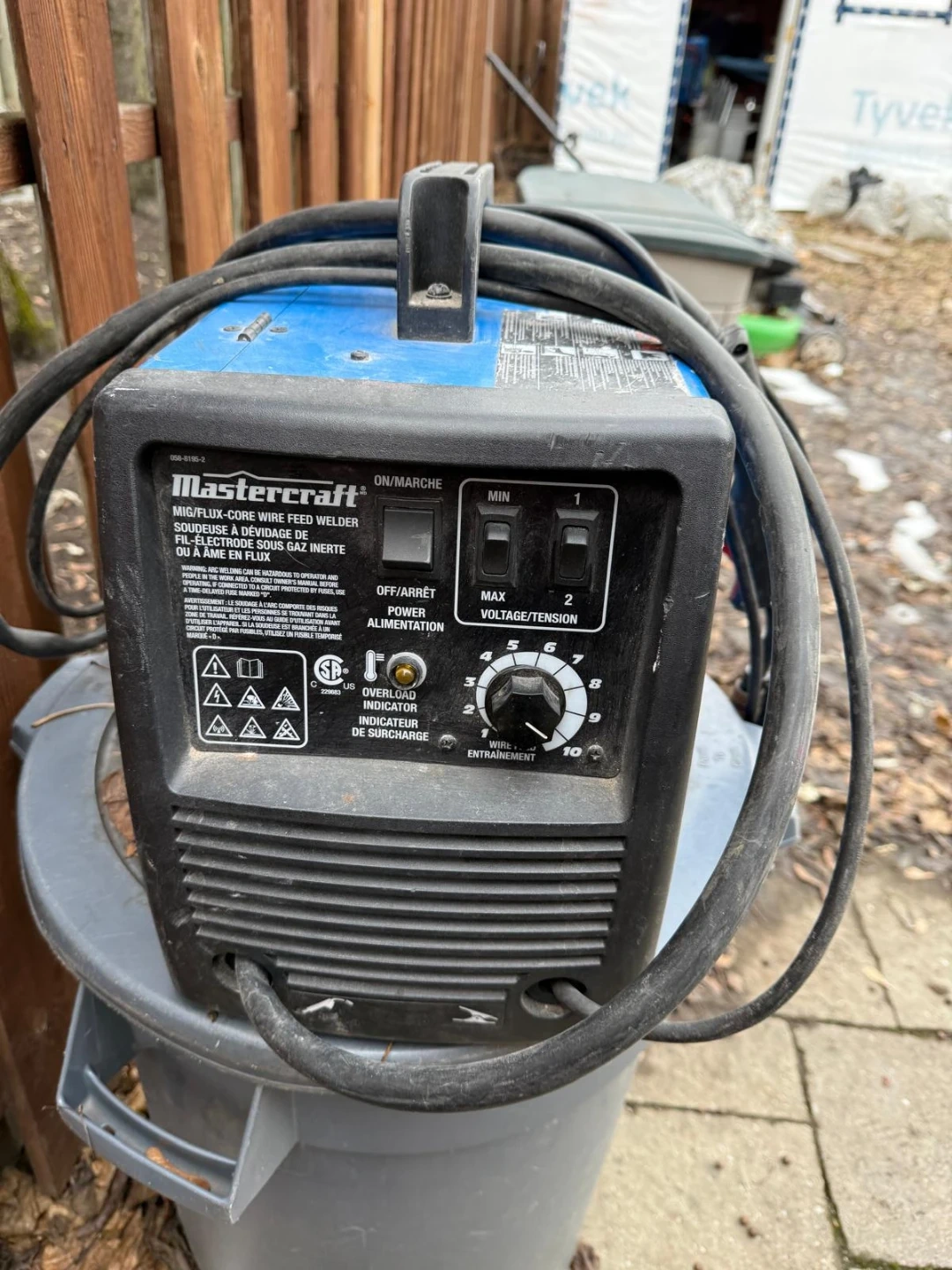 This is a Mastercraft MIG/Flux-Core wire feed welder. It's blue and black with a handle on top. It has adjustable voltage and wire feed speed.