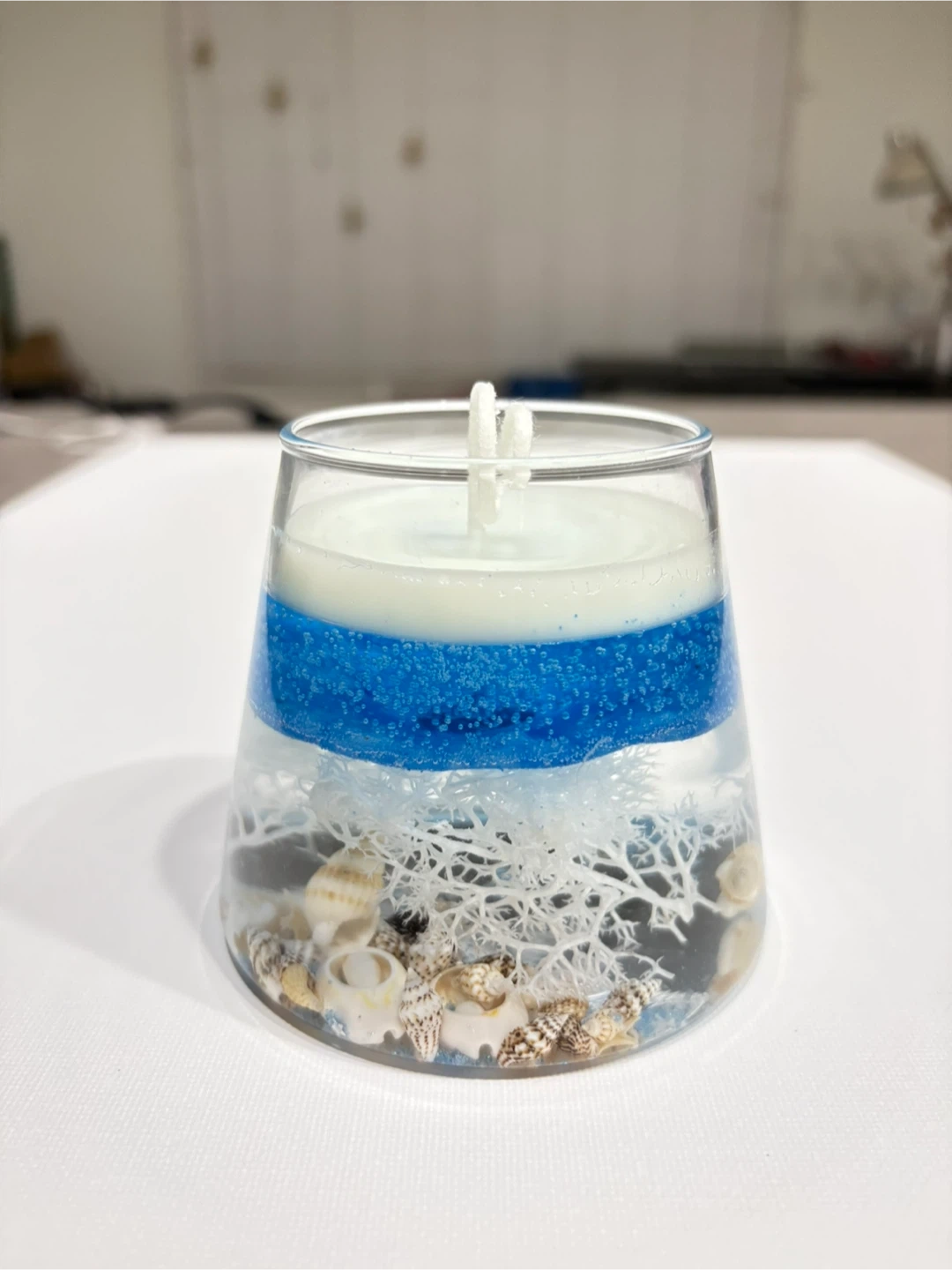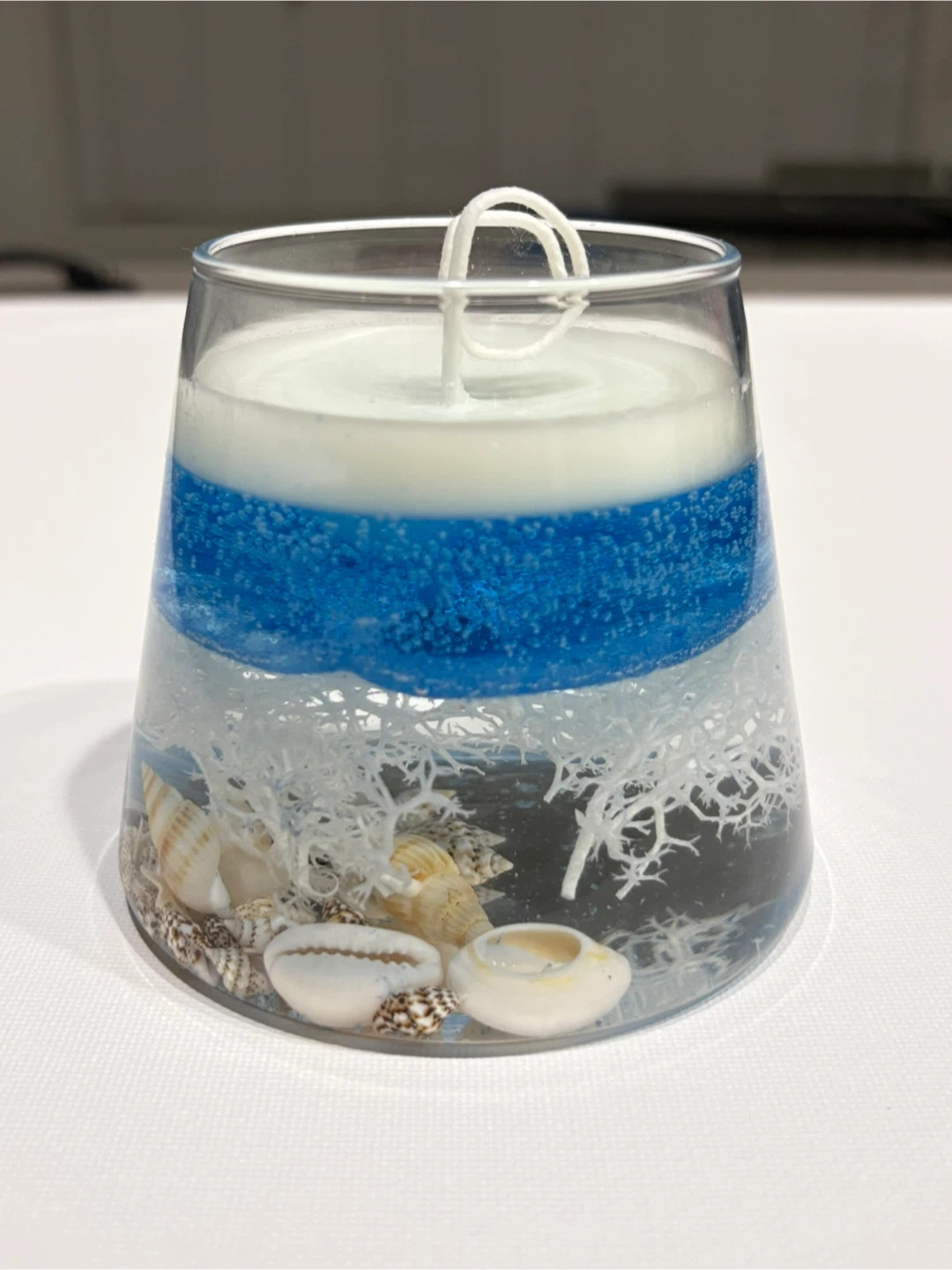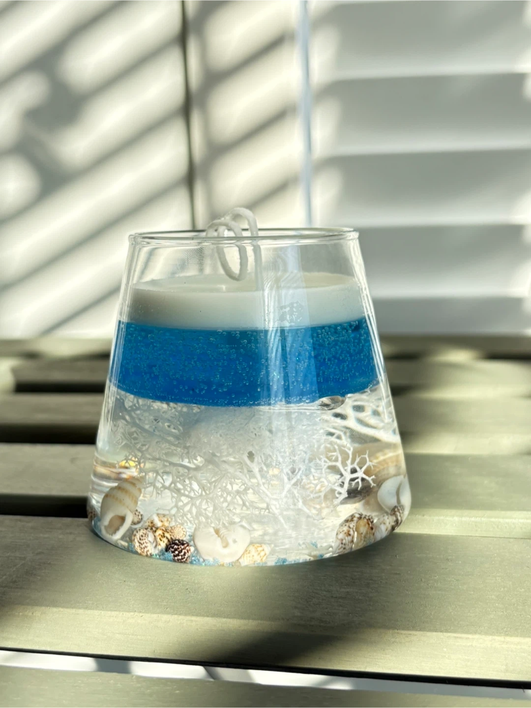 This decorative candle features a layered ocean-inspired design. It's embedded with seashells and white coral for a beautiful beachy look. The candle has a layered wax composition, creating a stunning visual appeal.