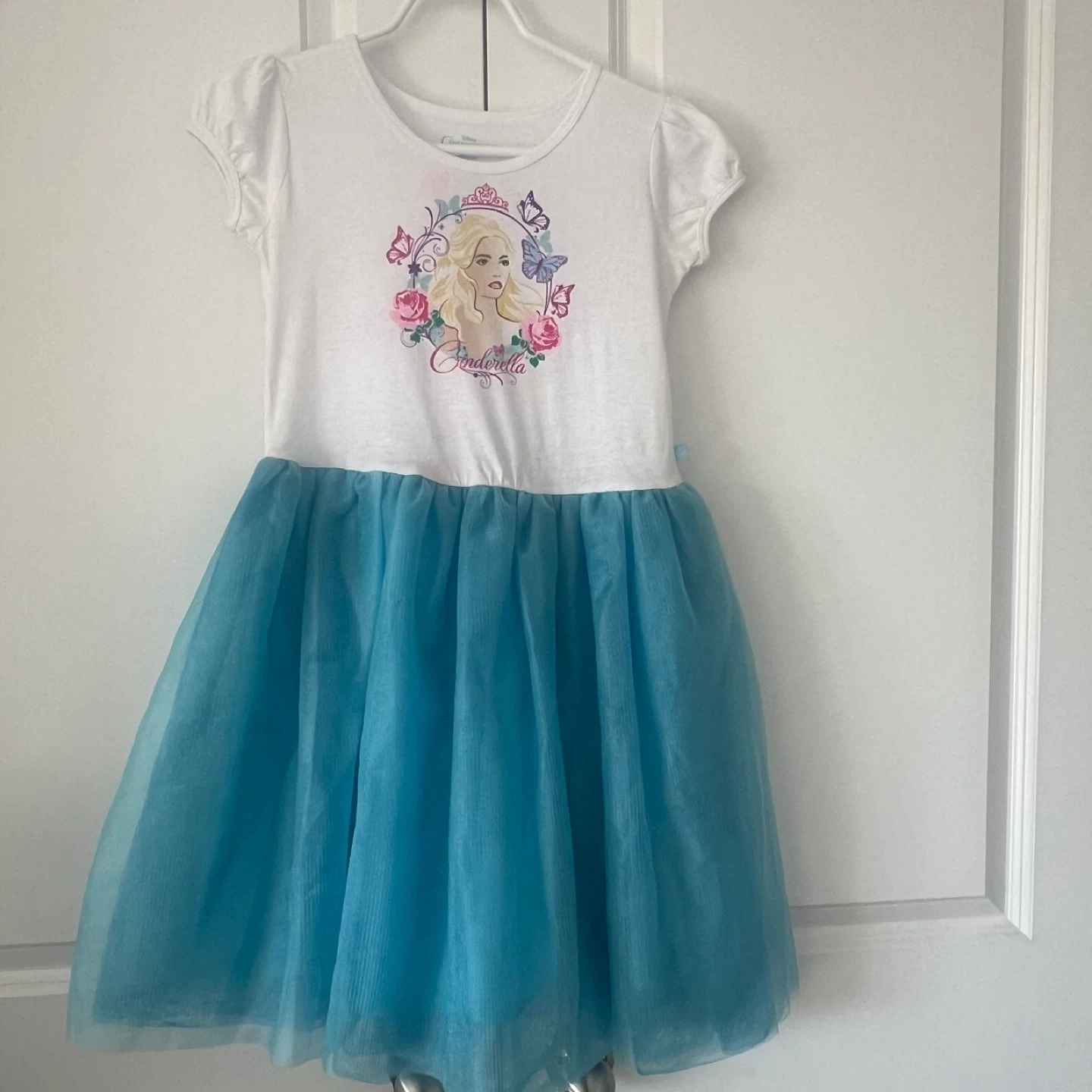 White t-shirt top with a graphic of Cinderella and flowers. Blue tulle tutu skirt attached. Great for dress-up or costumes!