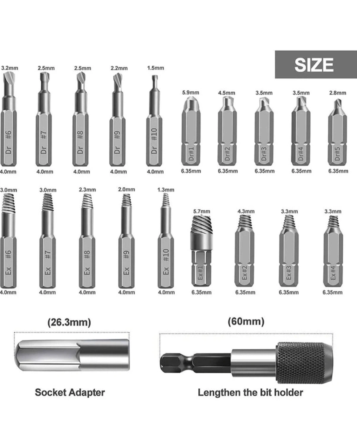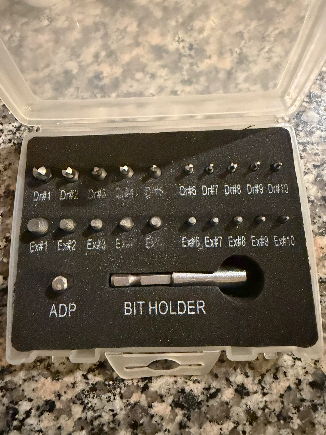 This set includes various drill bits and screw extractors in different sizes. It also comes with a socket adapter and a bit holder for convenience.