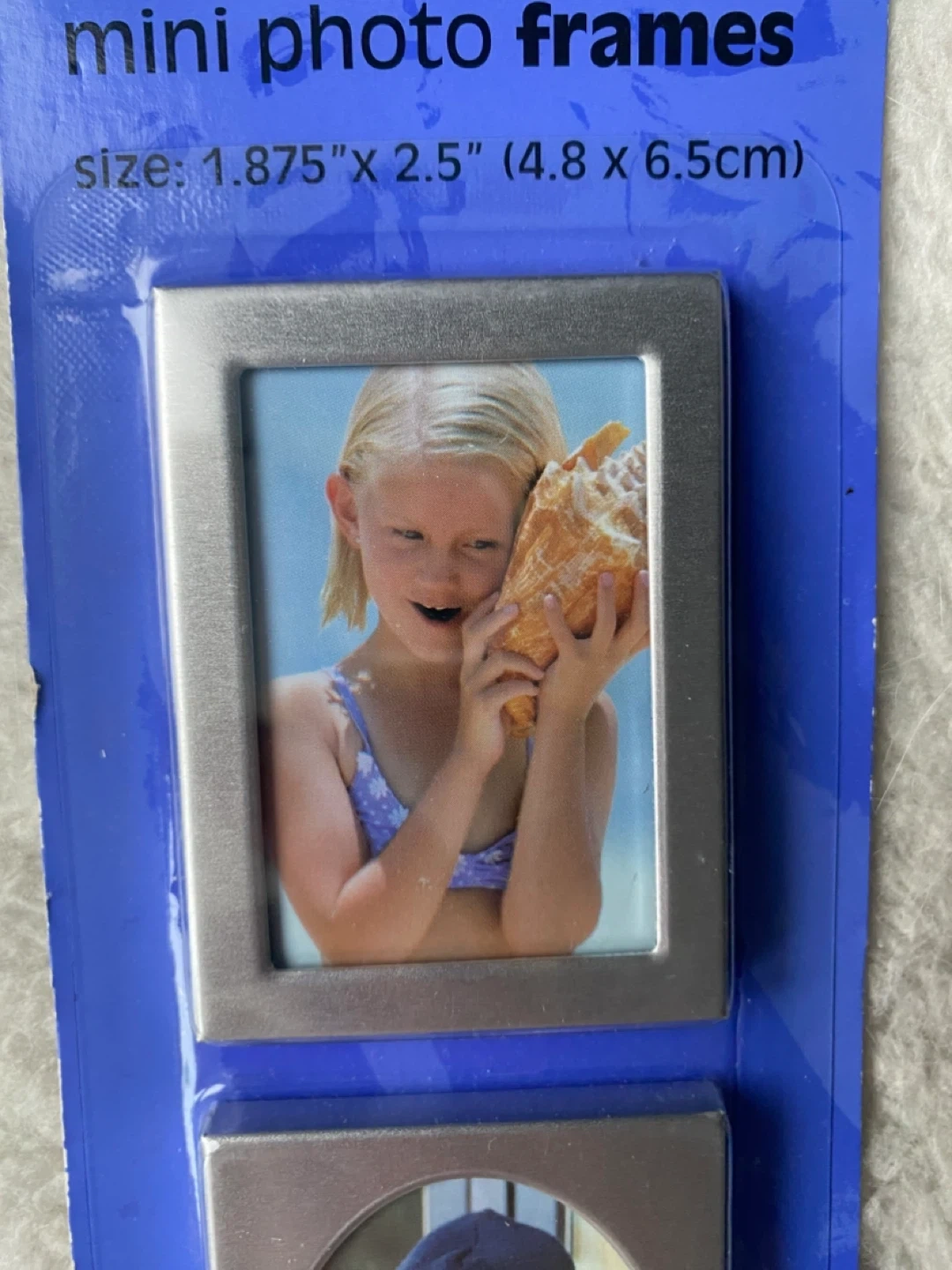 Set of three mini magnetic photo frames. Each frame fits photos measuring 1.875" x 2.5" (4.8 cm x 6.5 cm). Frames are silver coloured and magnetic.