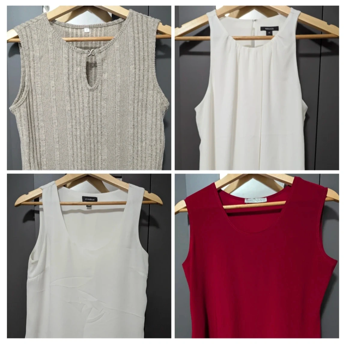 - Red Sleeveless Top: size likely a small/medium, in great condition.