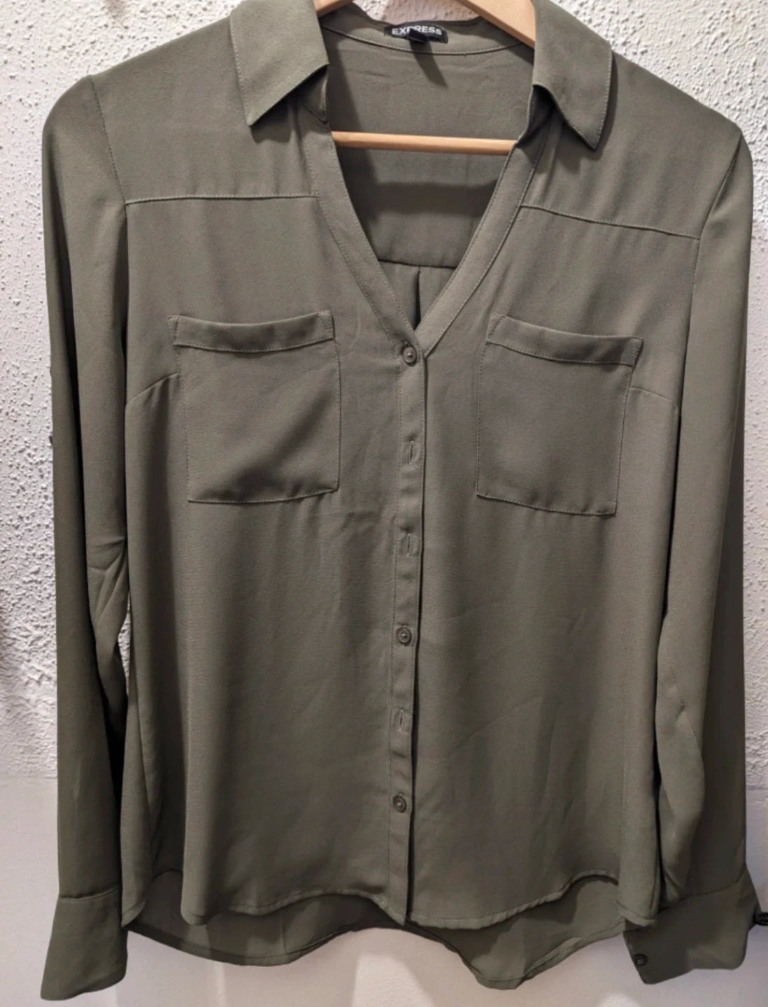 Pic 3: Express Army Green Buttoned-Down Blouse. Women's small.