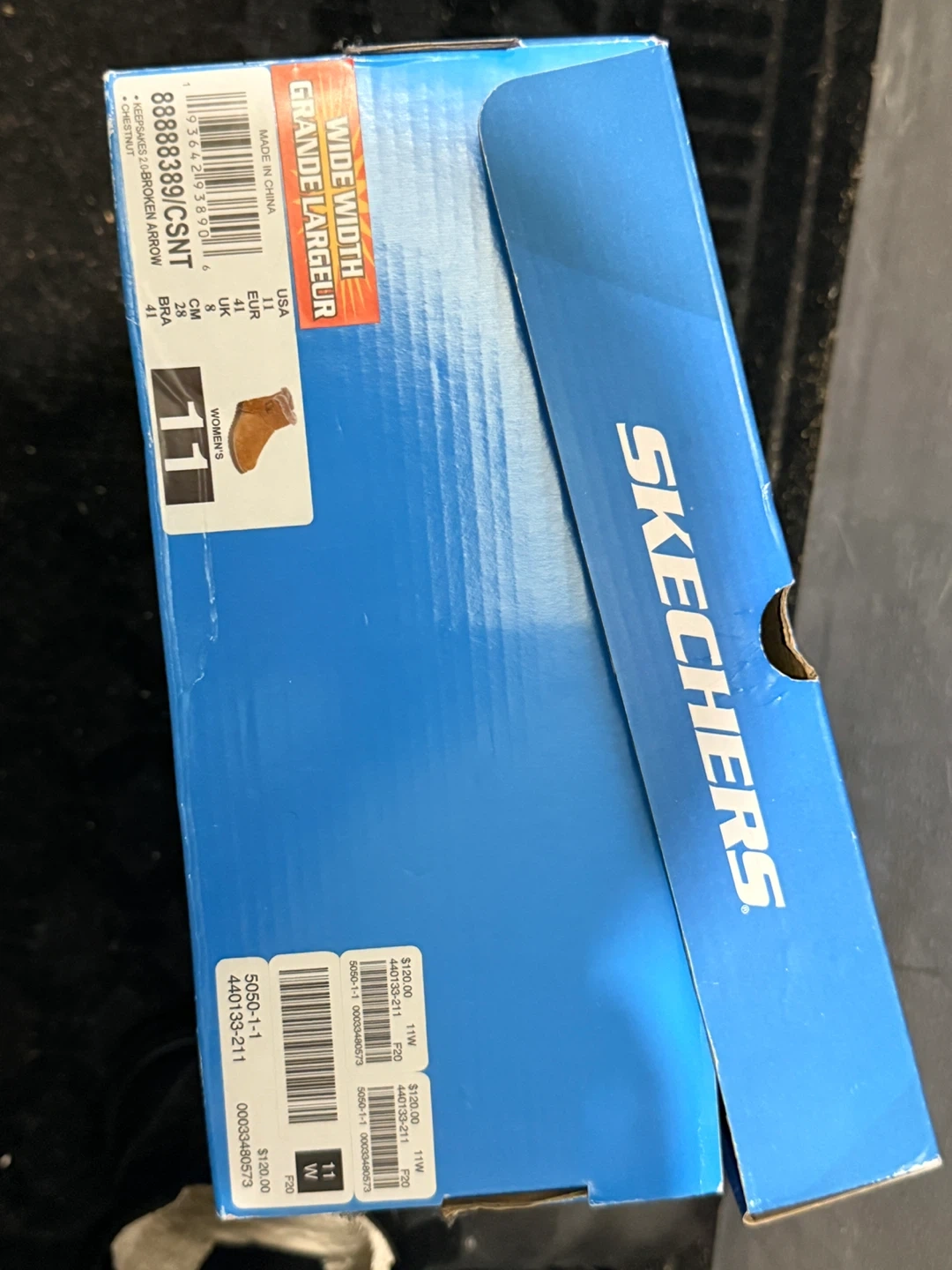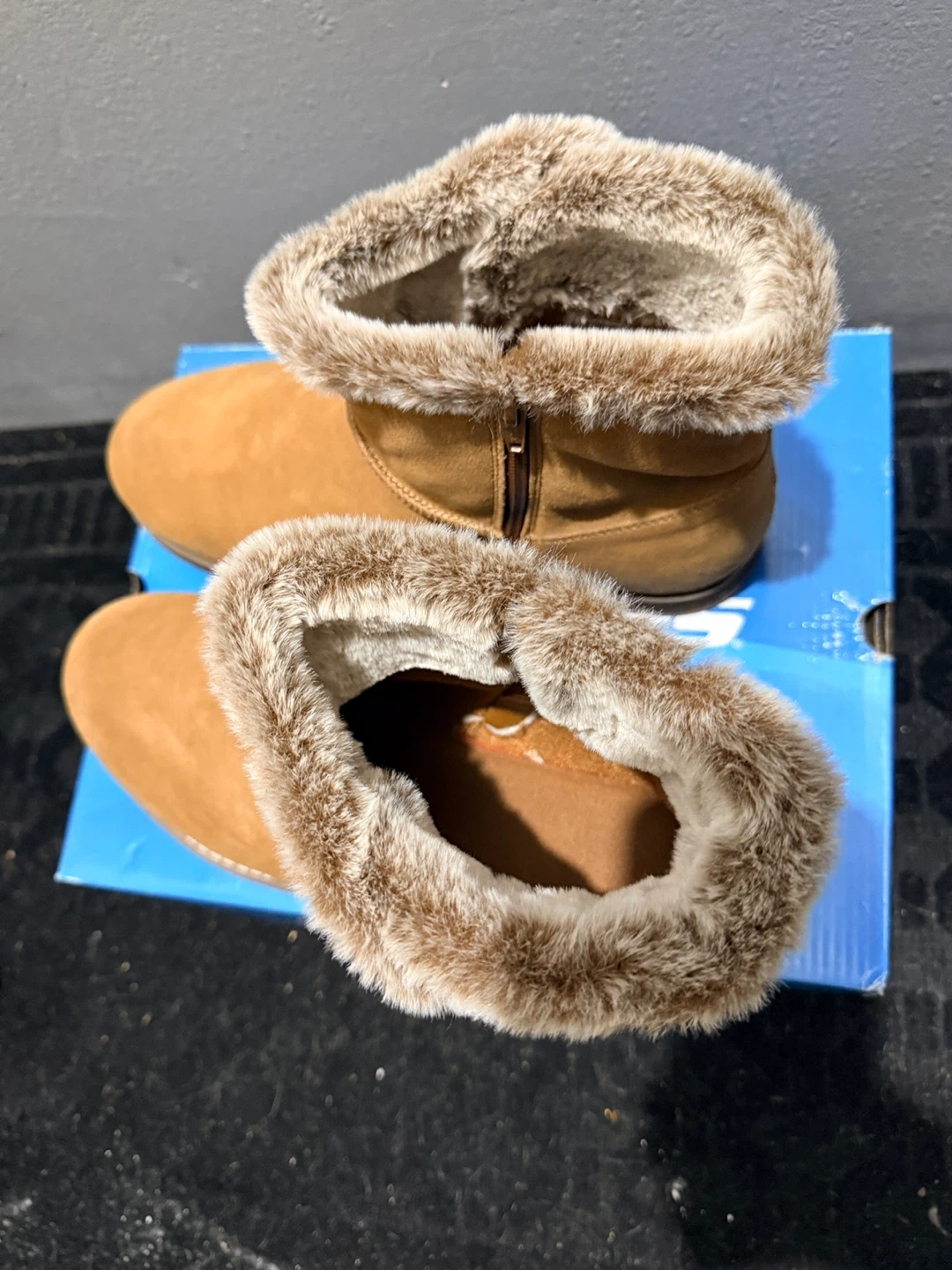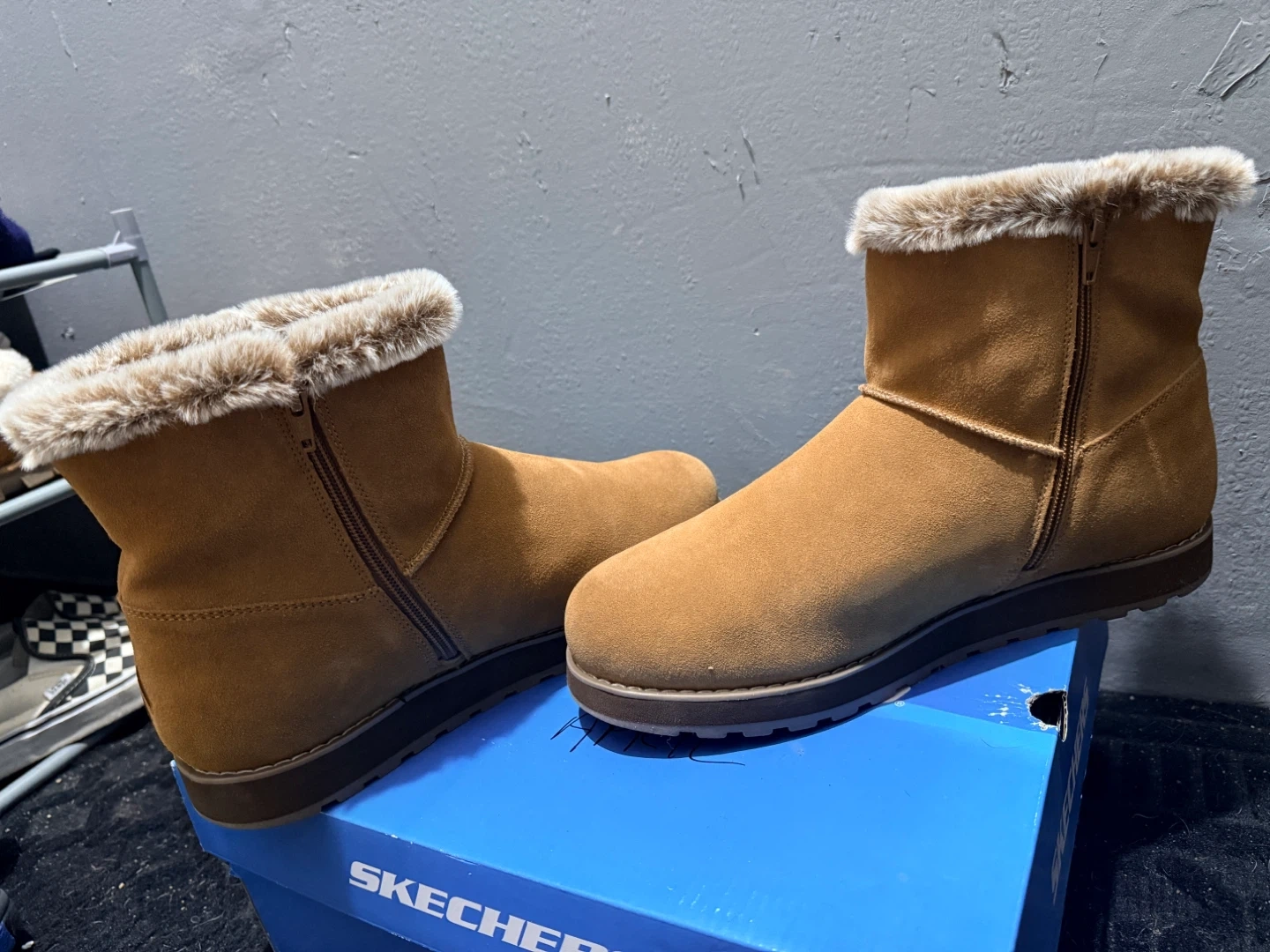 These Brand New never worn Skechers women's boots are in great condition and come with the original box! They are a women’s size 11 and feature a wide width for extra comfort. The colour is a lovely chestnut brown, perfect for the colder weather. The model number is 8888389/CSNT.