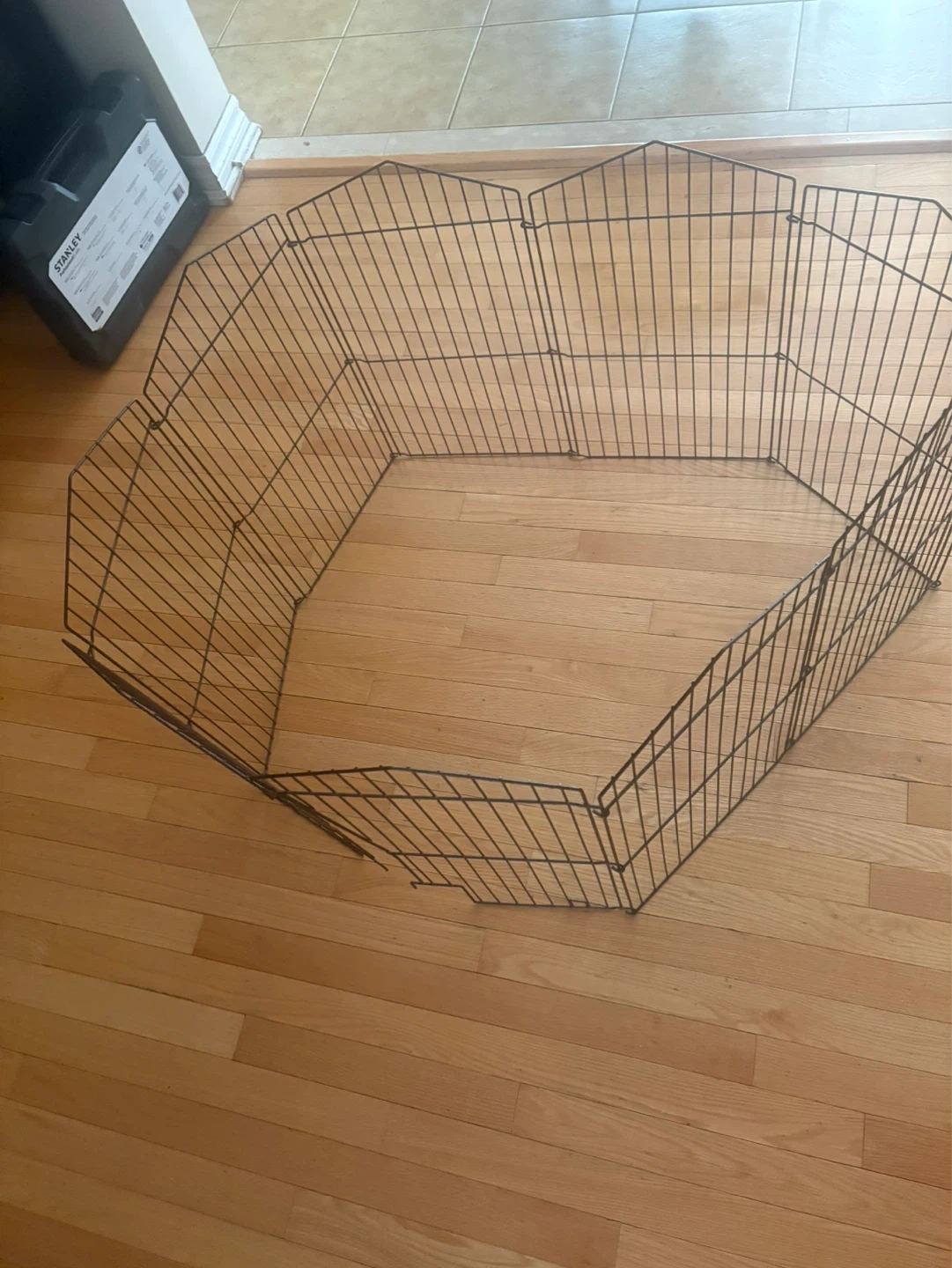Wire pet playpen with multiple panels to create an enclosed space. Panels connect to form a sturdy barrier. Great for keeping small pets safe indoors or outdoors!