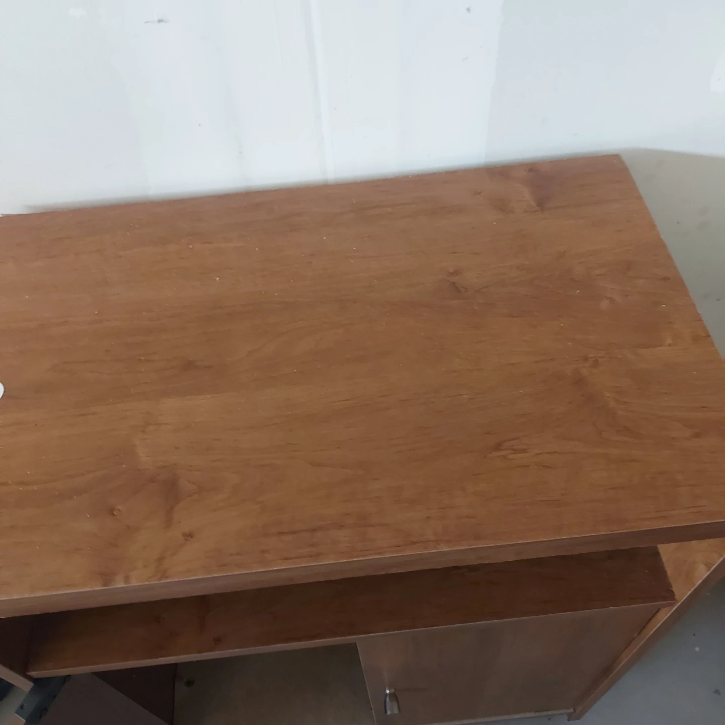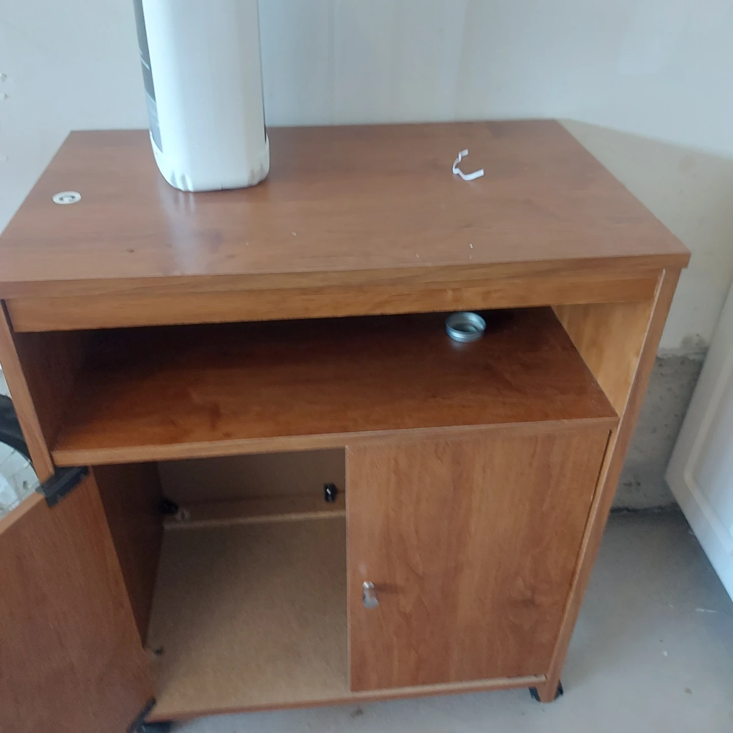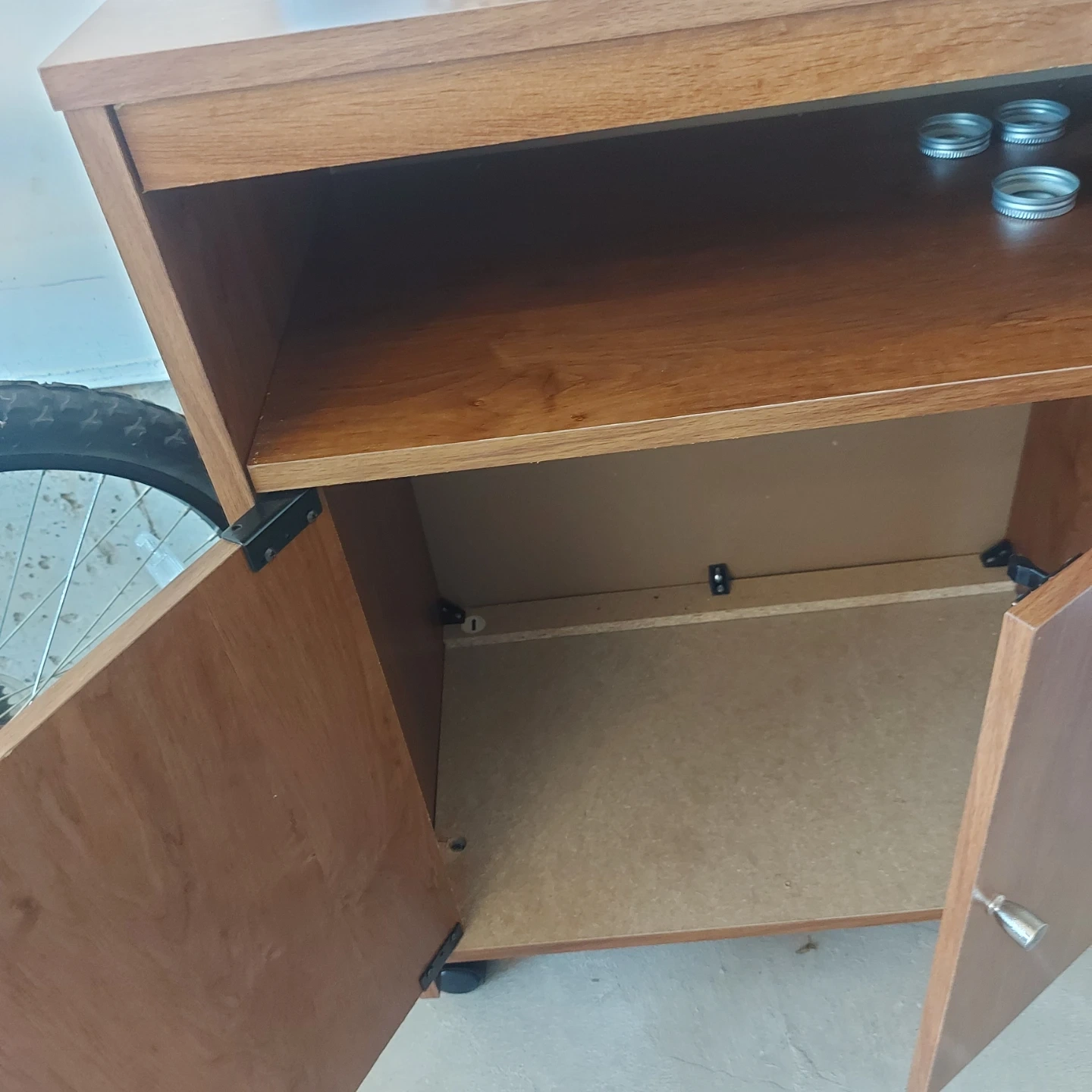 Compact wooden side table with a cabinet and open shelf. Features a light wood finish. It's great for small spaces needing storage. Perfect for a bedroom or living area.