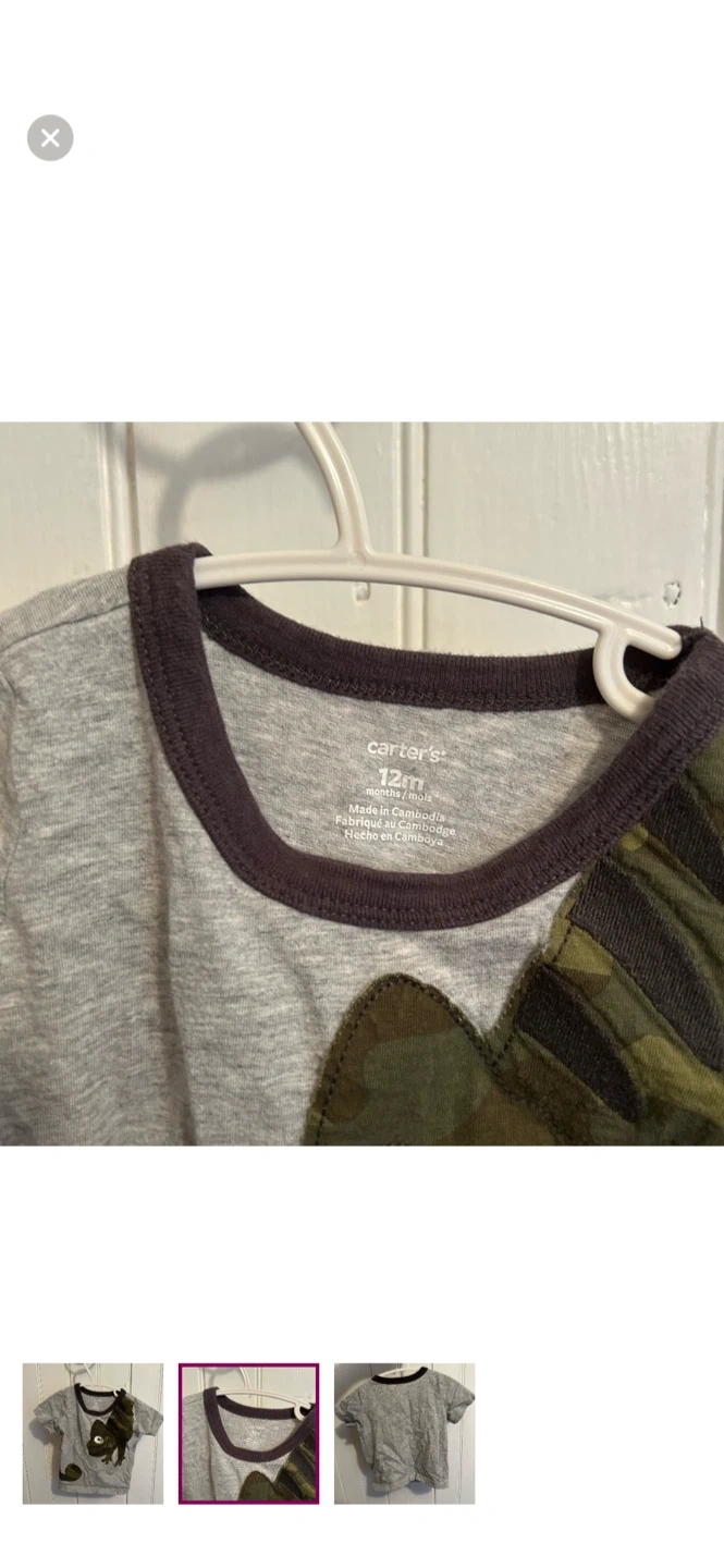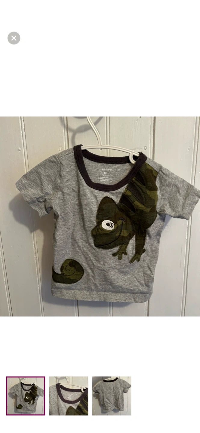 Carters brand. Short sleeve T-shirt. Grey with green & brown camo wrap around gecko graphic. Size 12m. Brand new condition