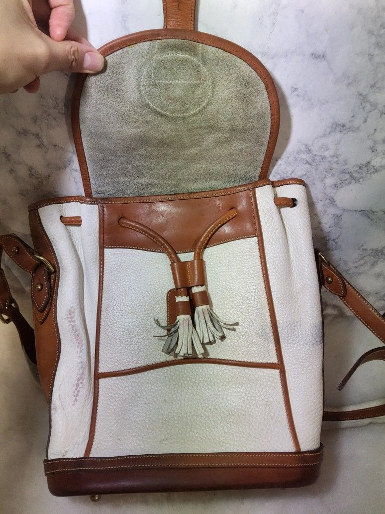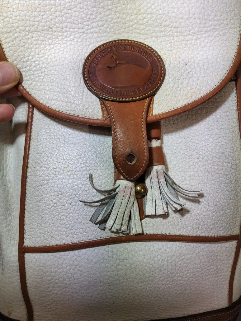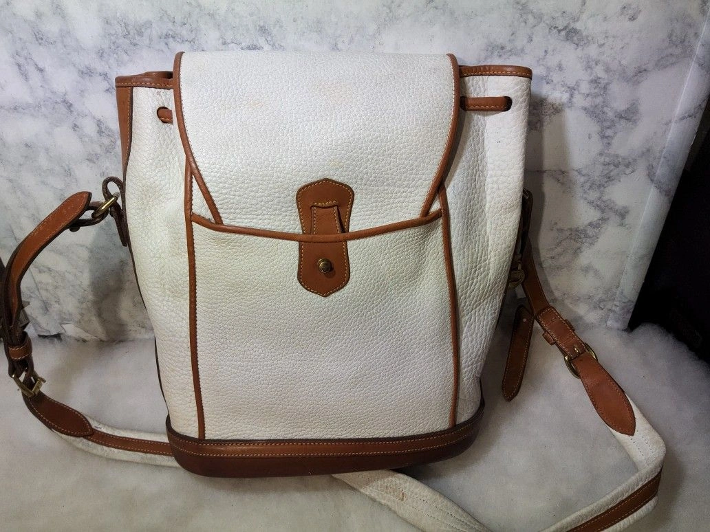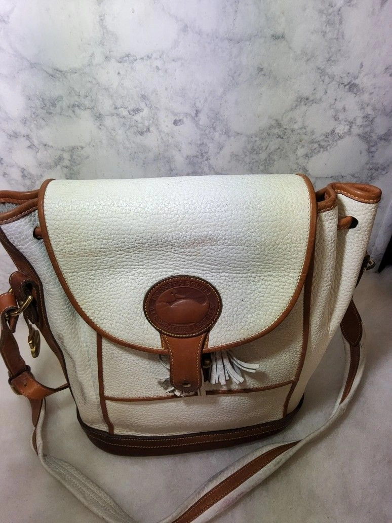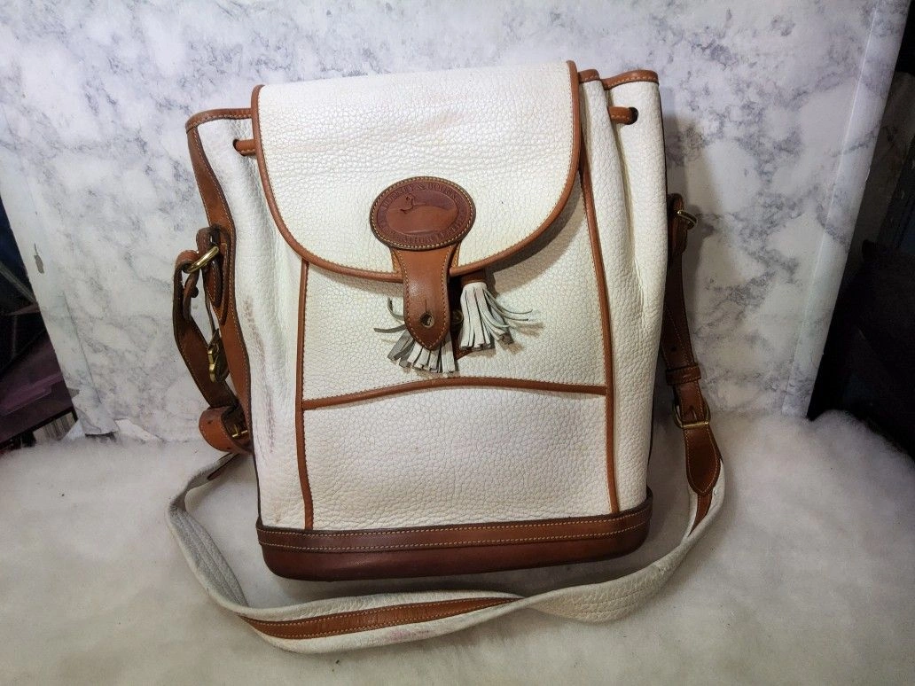 Rare vintage 90's Dooney & Bourke Dover Carrier Purse R10. This is a rare color and the most desirable of this line. Good used condition with some wear and minimal distressing. There are some red marks on the front and some pen marks. It has no major use or damage, but might need minor rehab. The interior is clean and full leather. The original tag has been cut (pictured). The bag is very sturdy and made with thick pebbled all-weather leather. Please note all pictures for exact details, so please make sure to look at them all. Ask questions if any. Color: White. Style: Crossbody.