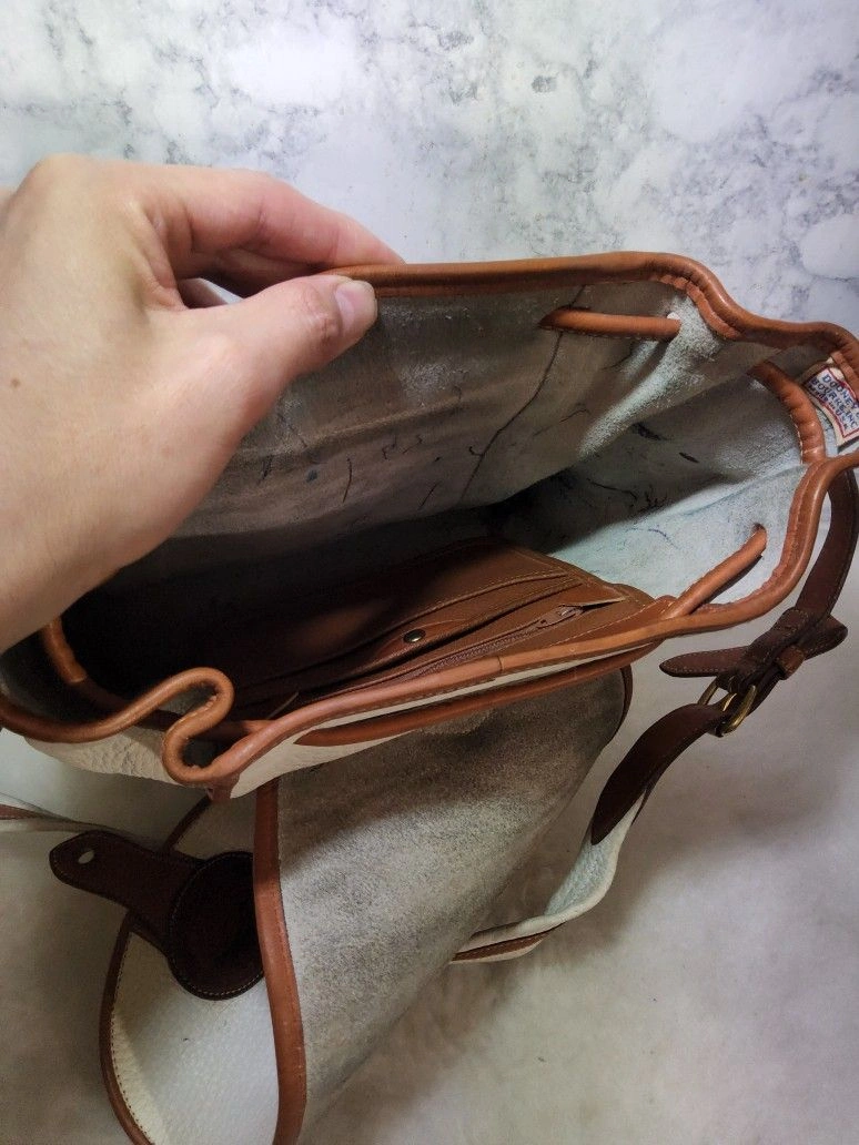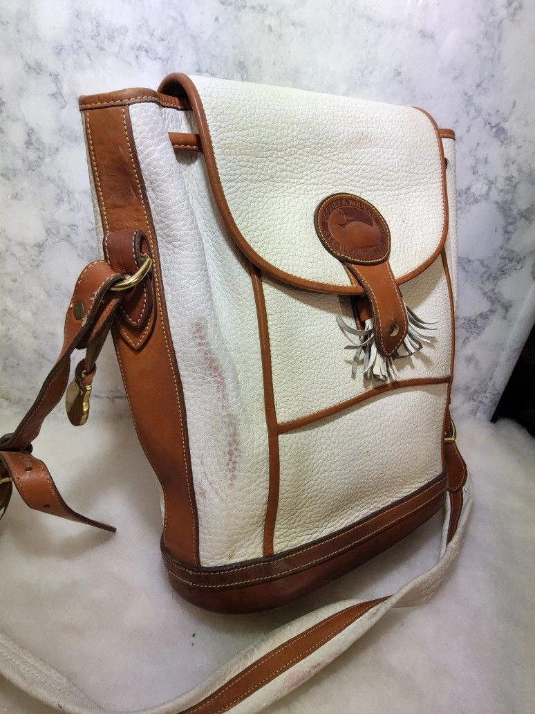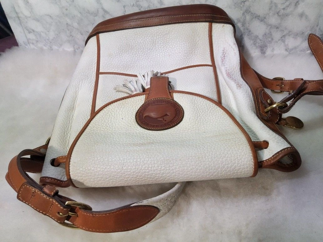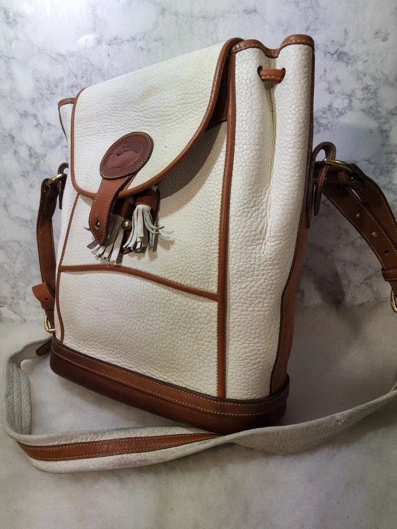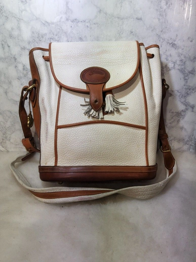 Rare vintage 90's Dooney & Bourke Dover Carrier Purse R10. This is a rare color and the most desirable of this line. Good used condition with some wear and minimal distressing. There are some red marks on the front and some pen marks. It has no major use or damage, but might need minor rehab. The interior is clean and full leather. The original tag has been cut (pictured). The bag is very sturdy and made with thick pebbled all-weather leather. Please note all pictures for exact details, so please make sure to look at them all. Ask questions if any. Color: White. Style: Crossbody.