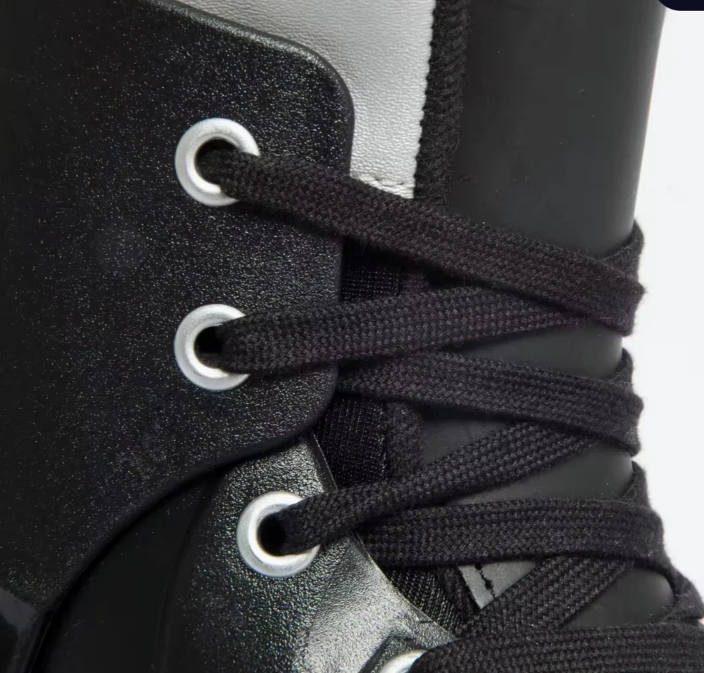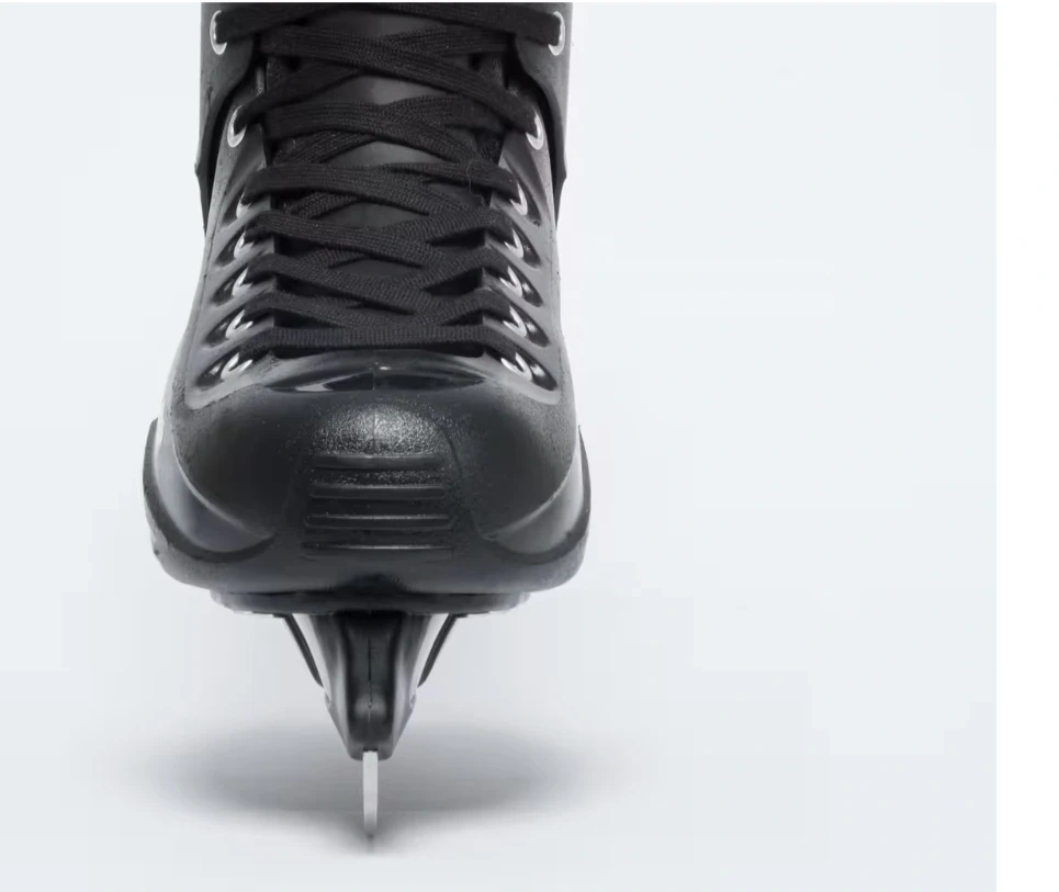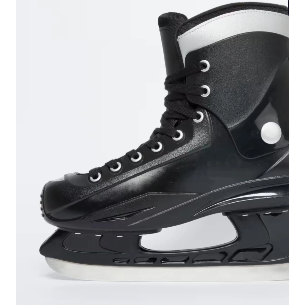 These are black ice skates. They feature a supportive boot and laces for a secure fit. Blades are made of stainless steel.