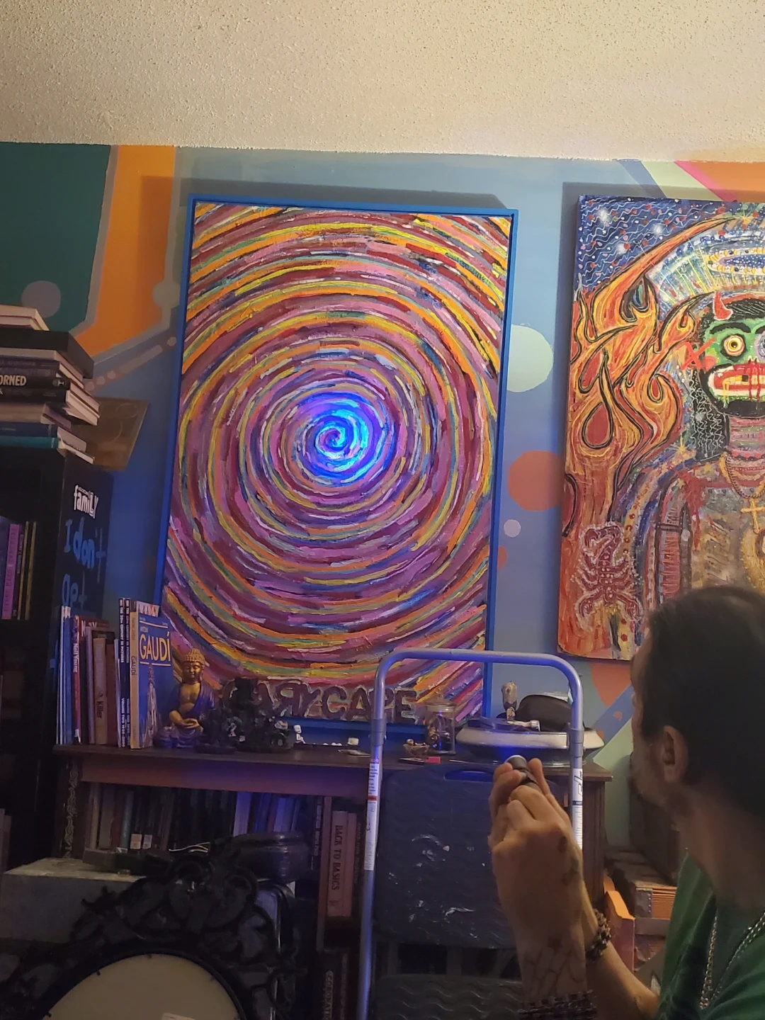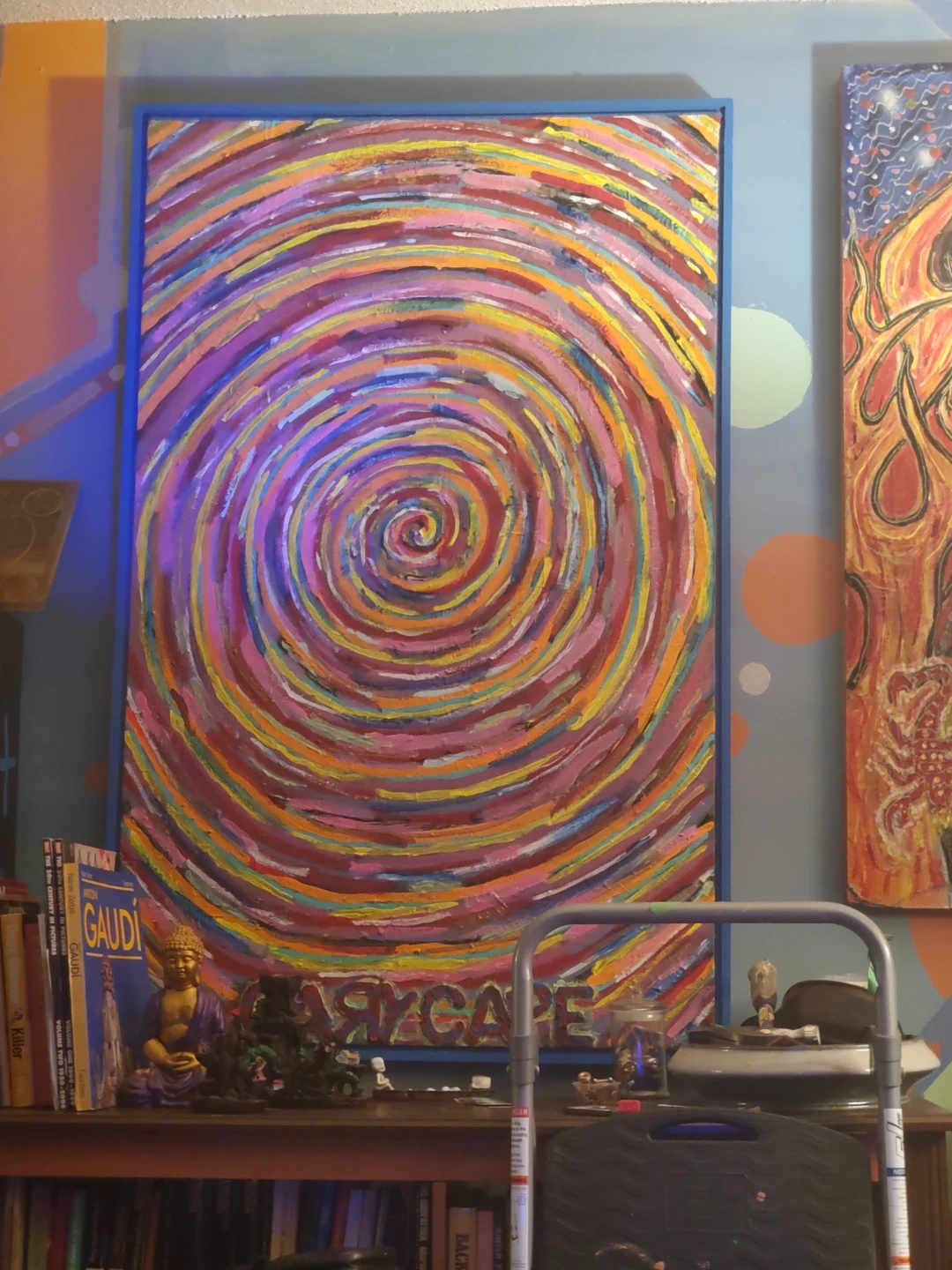 Colorful abstract painting featuring a hypnotic spiral design. It's framed with a blue border. The artwork has a vibrant, textured finish. This piece would add a pop of colour to any room!