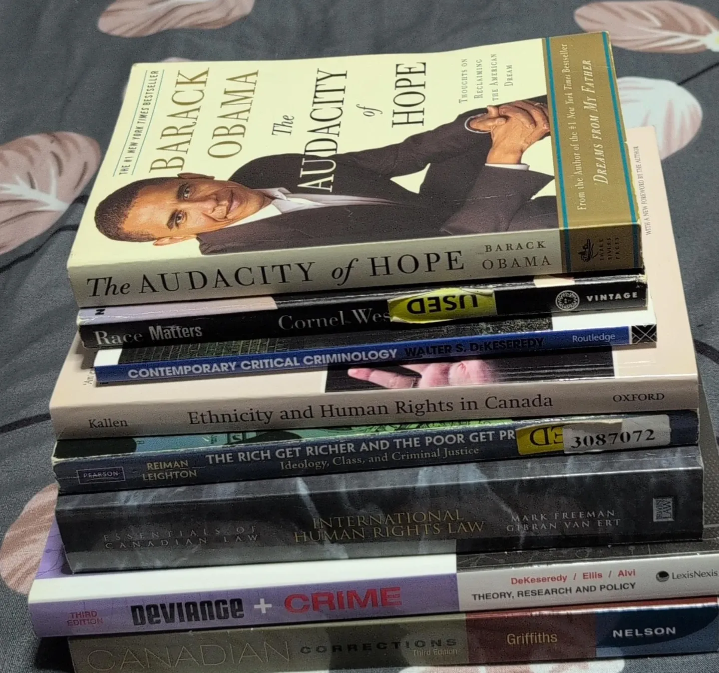 The Audacity of Hope by Barack Obama is a book of thoughts on reclaiming the American dream. Also included are other books on sociology and law subjects. Titles include Race Matters, Contemporary Critical Criminology, Ethnicity and Human Rights in Canada, The Rich Get Richer and the Poor Get Pre, Essentials of Canadian Law, International Human Rights Law, Deviance + Crime, and Canadian Corrections.