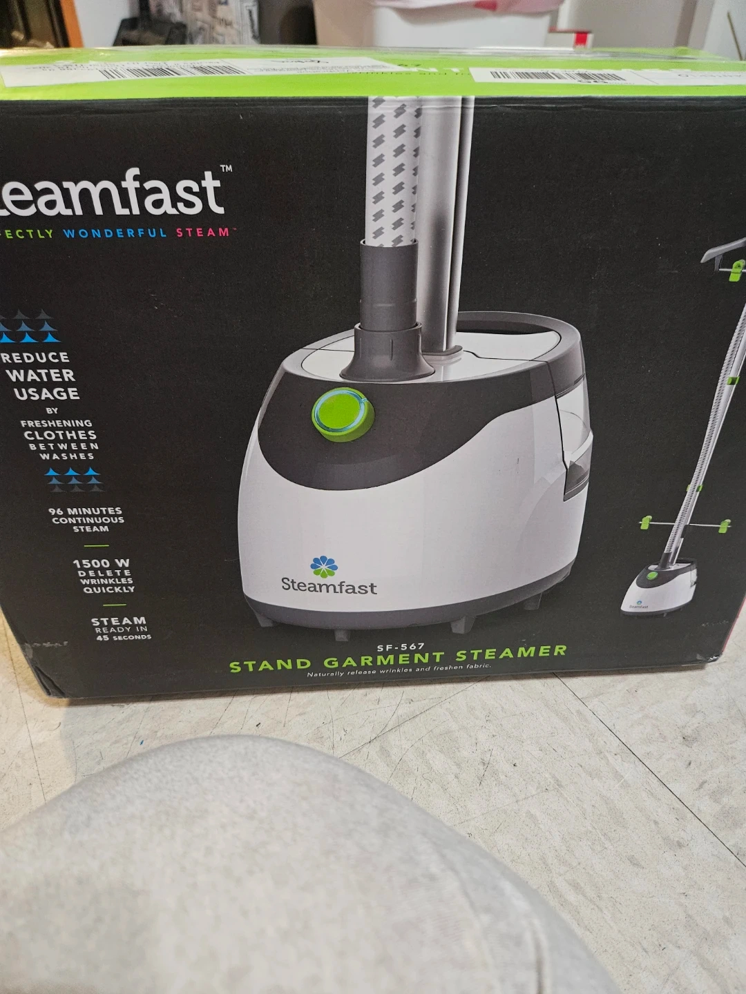 Steamfast stand garment steamer, model SF-687. It's white and gray. Features 1500 W power for quick wrinkle removal. Delivers 96 minutes of continuous steam and is ready in 45 seconds. This steamer is useful for freshening clothes between washes.