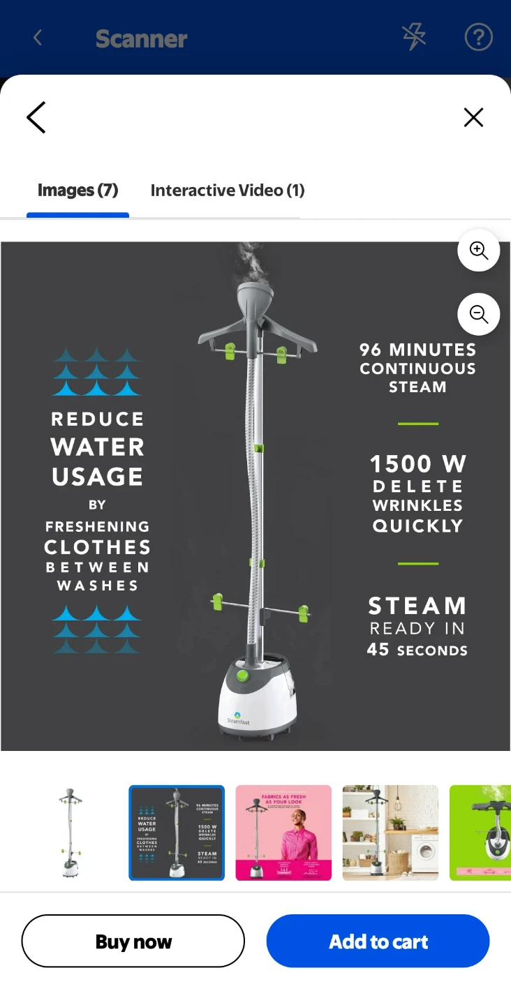 Steamfast stand garment steamer, model SF-687. It's white and gray. Features 1500 W power for quick wrinkle removal. Delivers 96 minutes of continuous steam and is ready in 45 seconds. This steamer is useful for freshening clothes between washes.