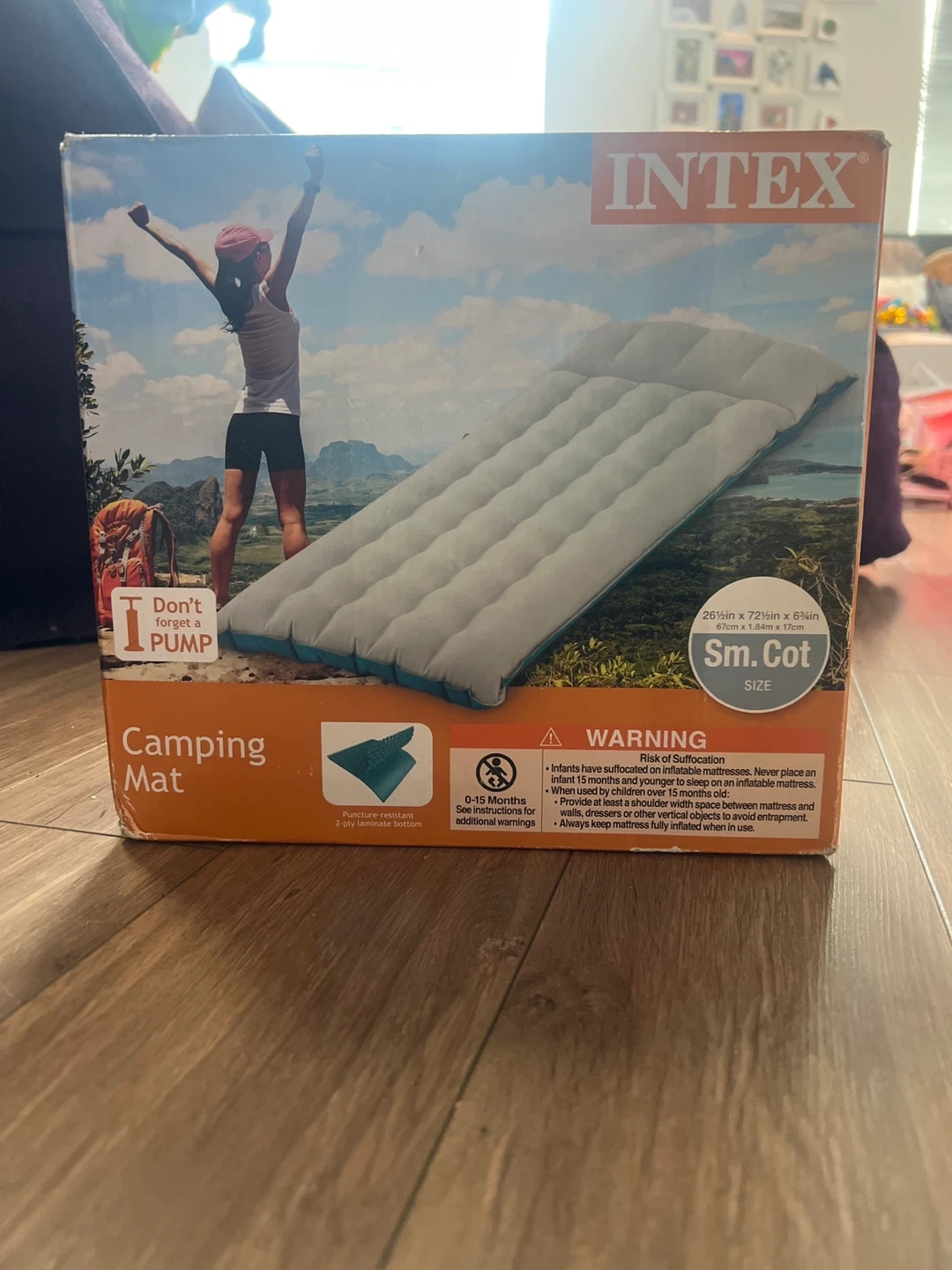 Brand new inbox never used: This is an Intex Camping Mat in a Sm. Cot size. It's puncture-resistant with a 2-ply laminate bottom and doesn't require a separate pump. The mat measures 26.5in x 72.5in x 6.25in.