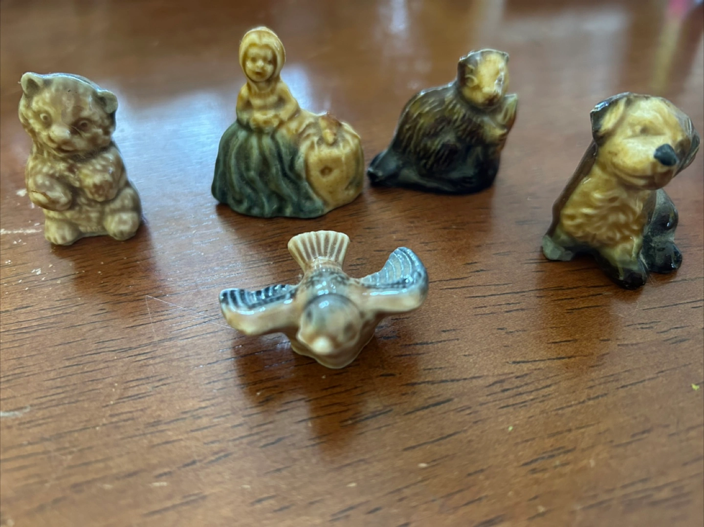 Selling a set of Wade Whimsies figurines. Includes a bear, a girl, a beaver, a dog, and a bird. They are in good condition and would make a cute addition to any collection