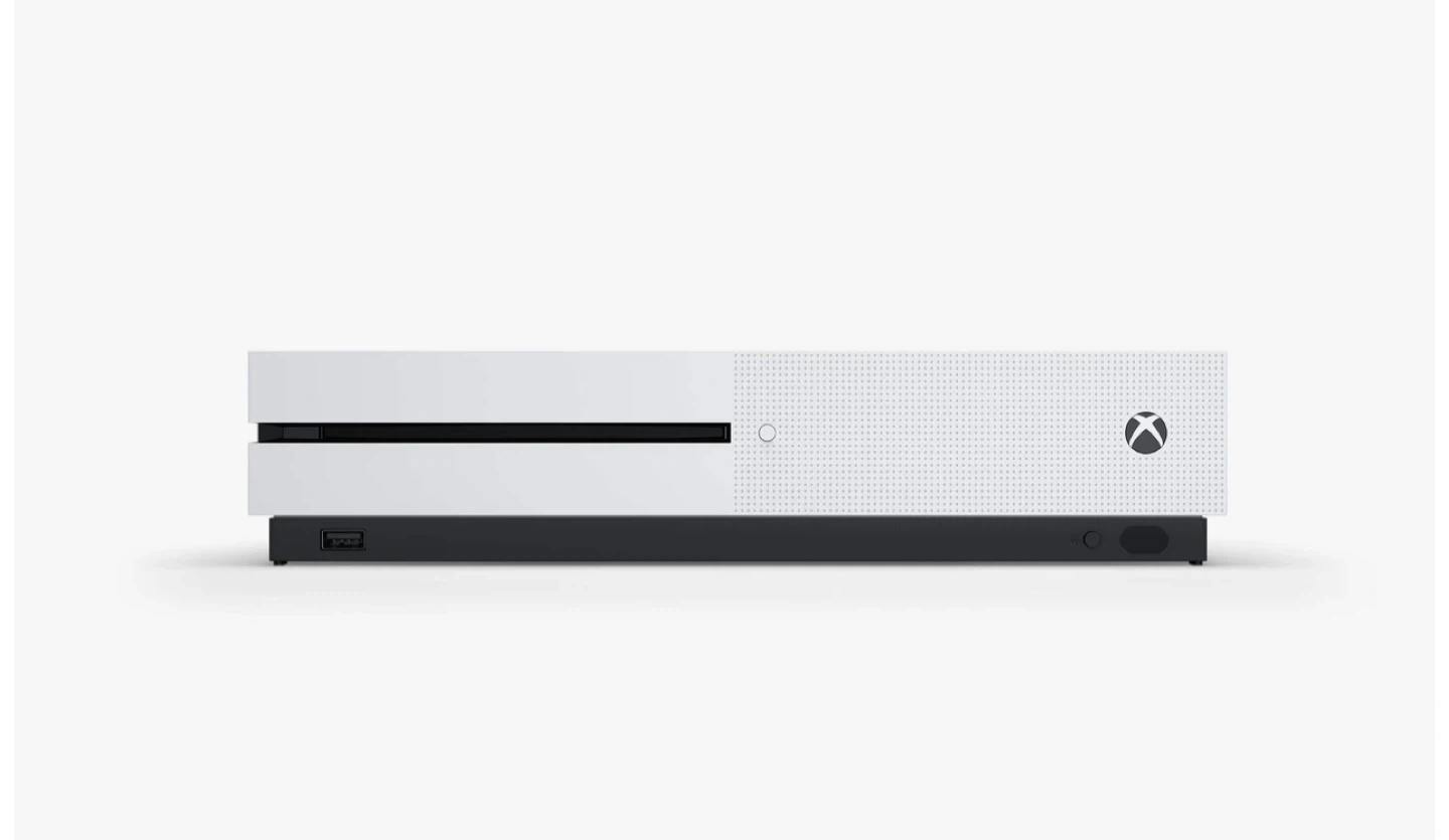This is a white Microsoft Xbox One S gaming console with a 1TB hard drive. It comes with a white controller. The console supports 4K HDR and Blu-ray playback.