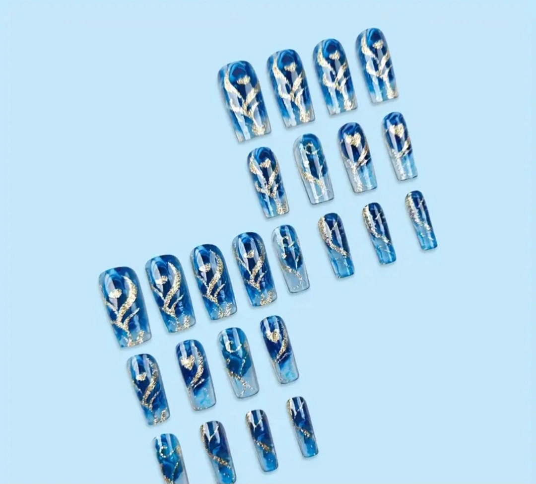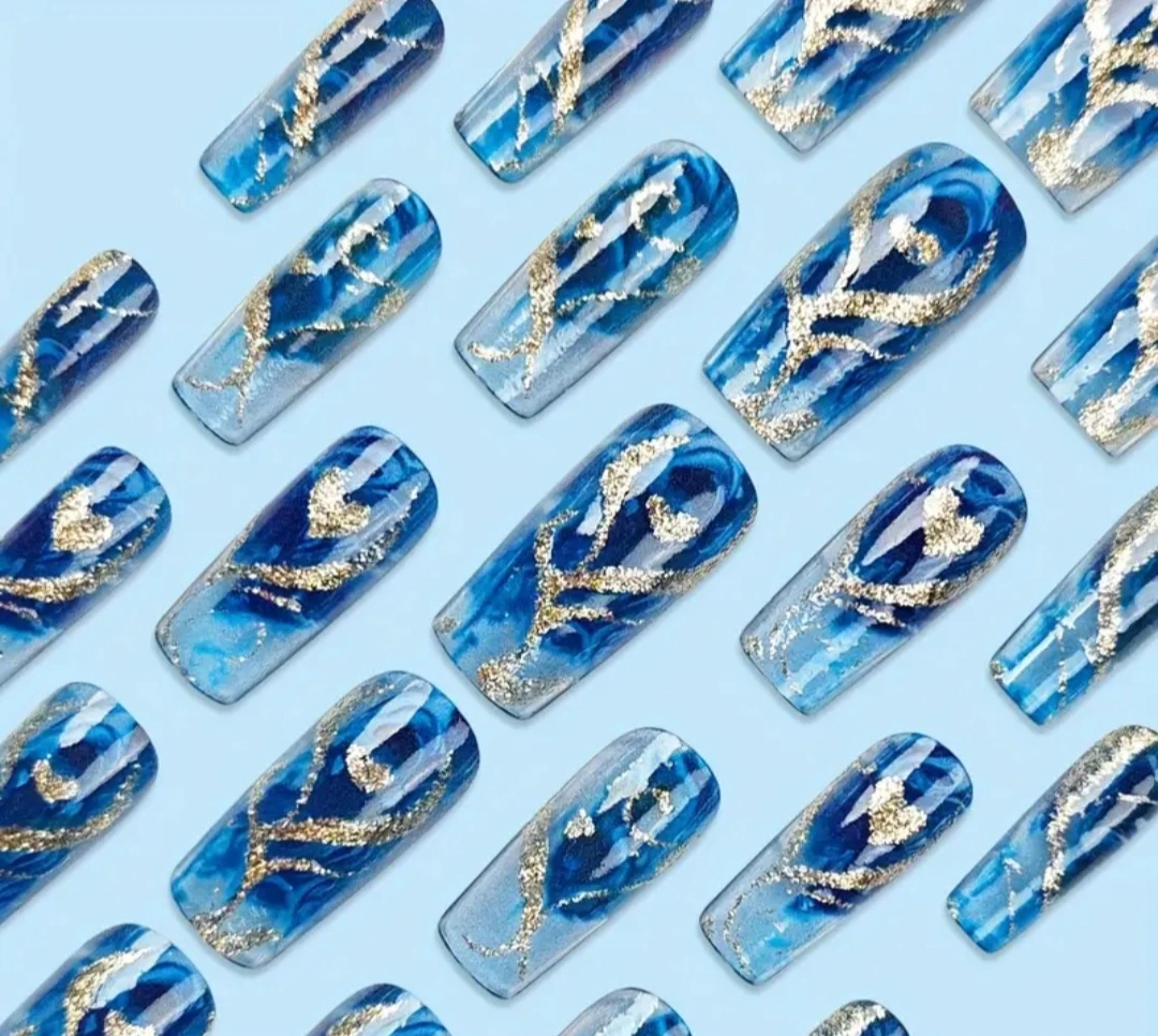 These are a set of brand new, blue marble press on nails! They come with 24 jelly tabs, a mini file and a stick. Perfect for a quick and easy manicure at home