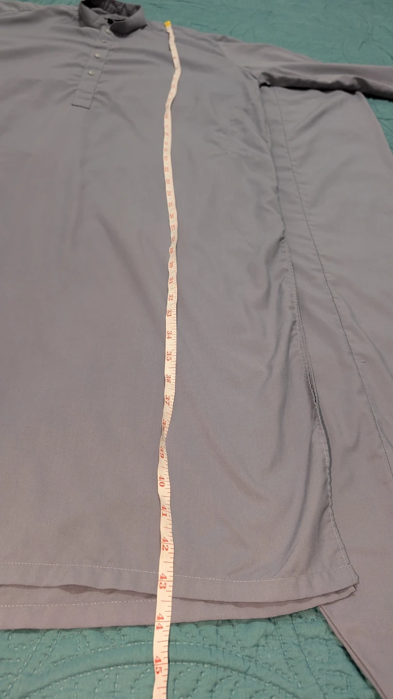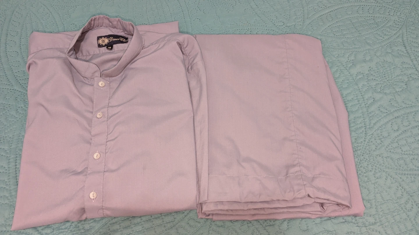 Selling a menswear kurta pajama set in size XL. The kurta measures approximately 45 inches in length, with the pajama bottoms having a similar inseam length. The waist measures approximately 38 inches. The colour is a light grey-lavender. Used twice. Barely stains. Reach out if anybody interested.