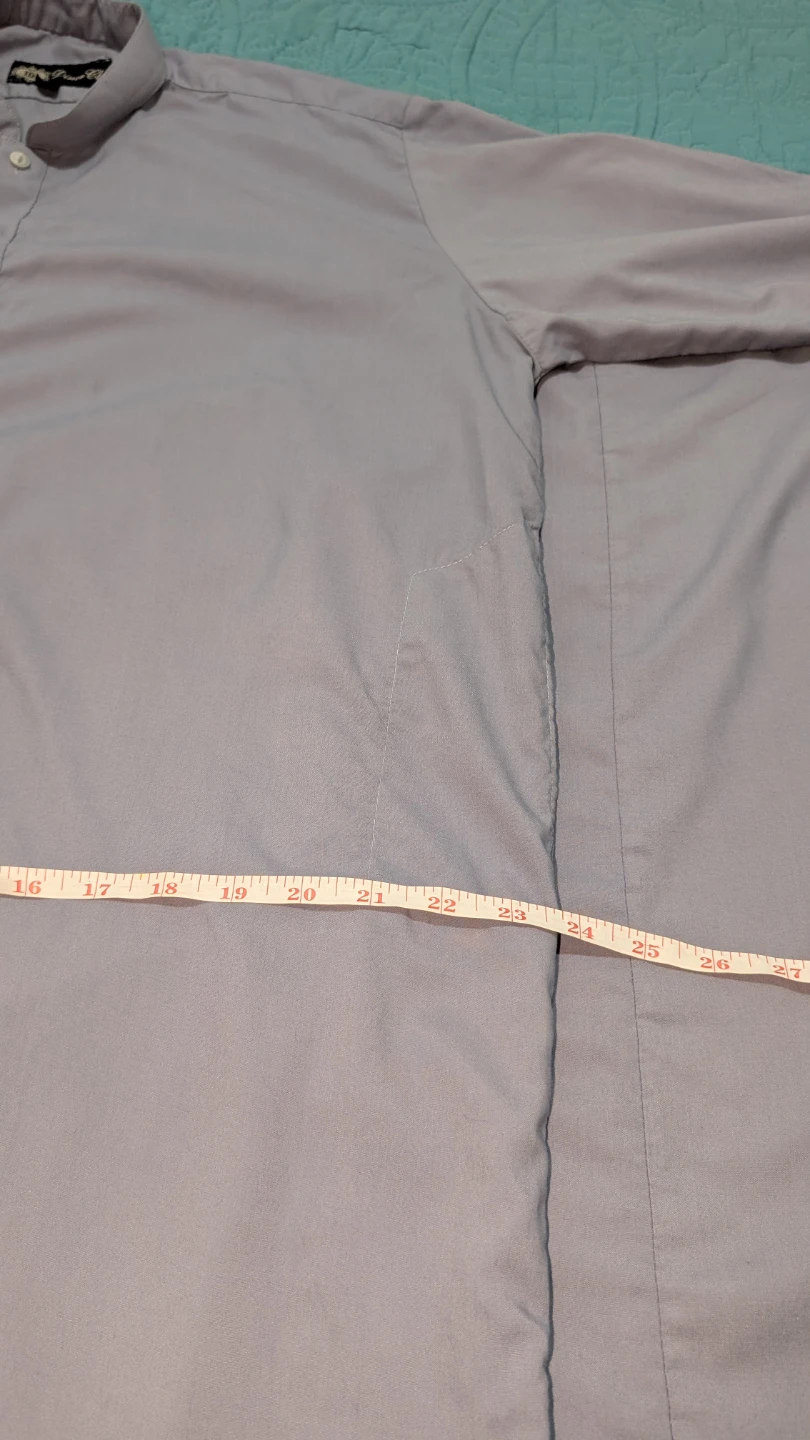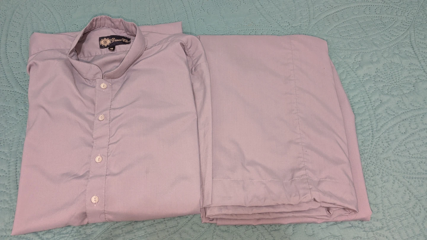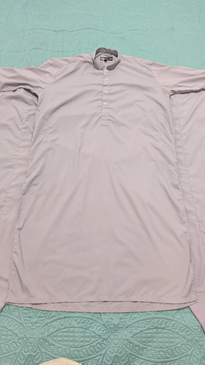 Selling a menswear kurta pajama set in size XL. The kurta measures approximately 45 inches in length, with the pajama bottoms having a similar inseam length. The waist measures approximately 38 inches. The colour is a light grey-lavender. Used twice. Barely stains. Reach out if anybody interested.