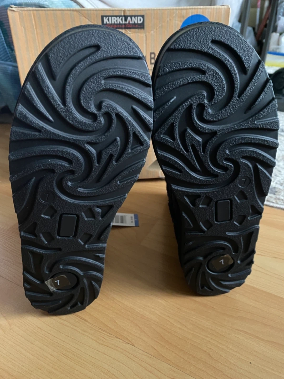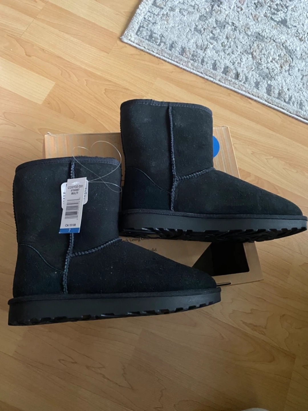 These black Kirkland Signature short shearling boots offer genuine shearling sock lining for cushioning and warmth. The boots are black and come in size 7. New with tags, never worn. Cash only.
