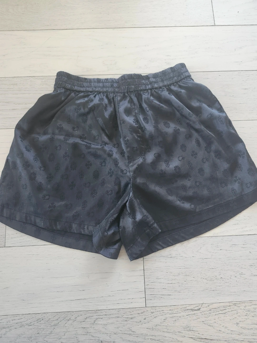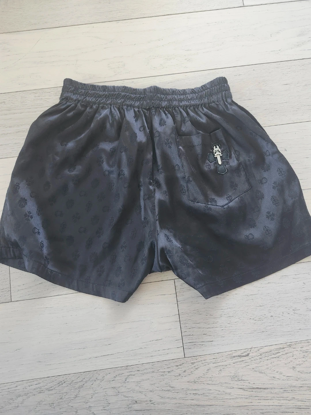 These black silk shorts from Chrome Hearts feature an all-over logo pattern. They have a comfortable elastic waistband and a pocket on the back. Great for lounging or a stylish casual look!