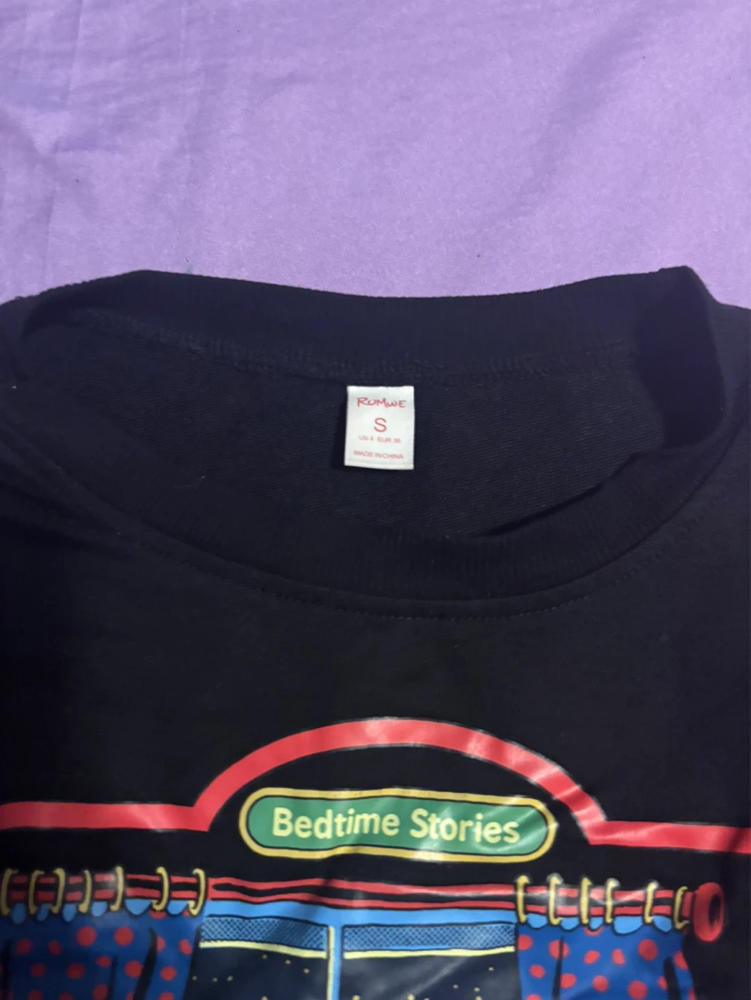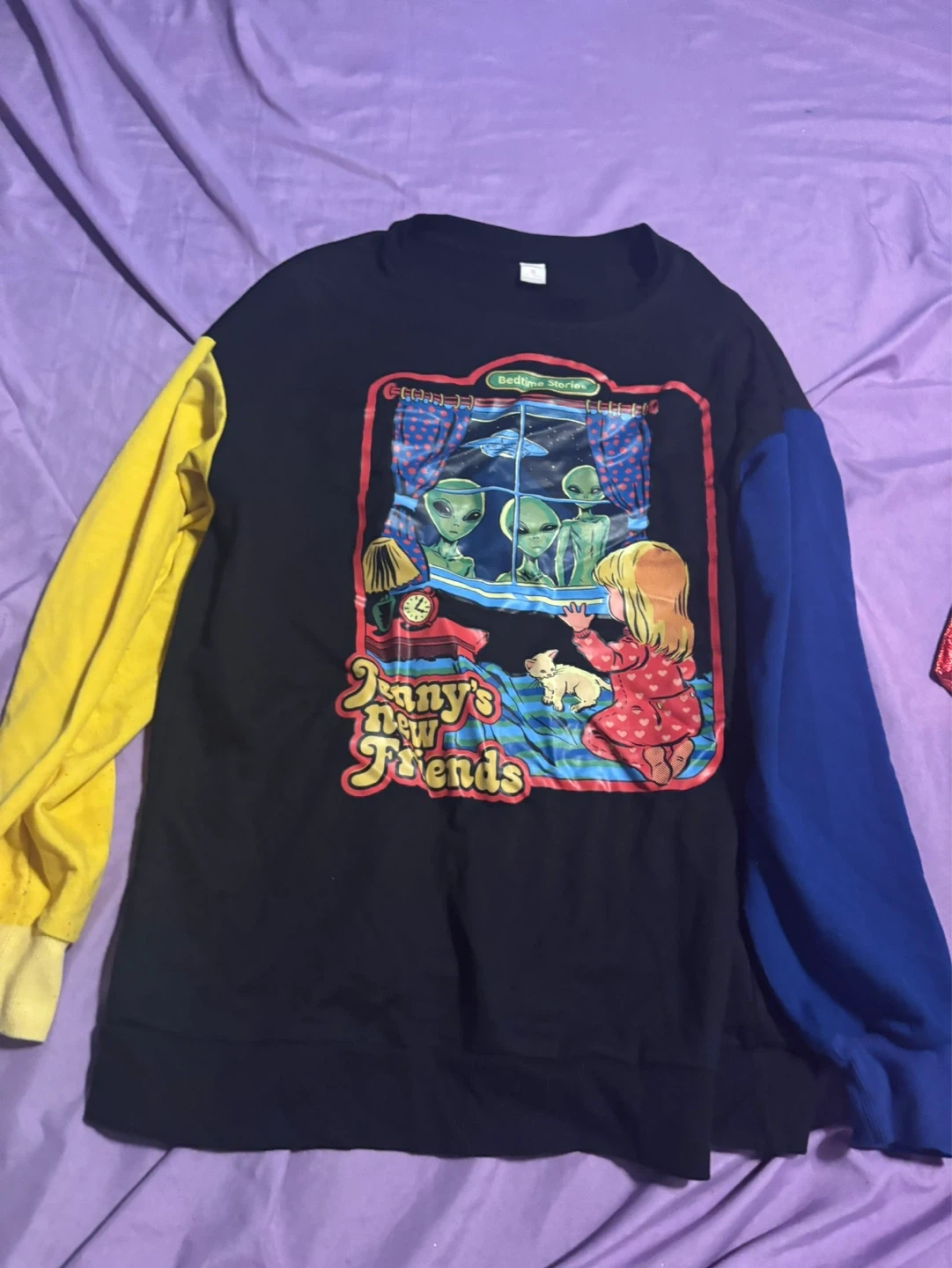 This RUMUE t-shirt features a "Bedtime Stories" graphic with "Jenny's New Friends" on the front. It's a size small with colour-blocked sleeves in yellow and blue. Cotton blend material.