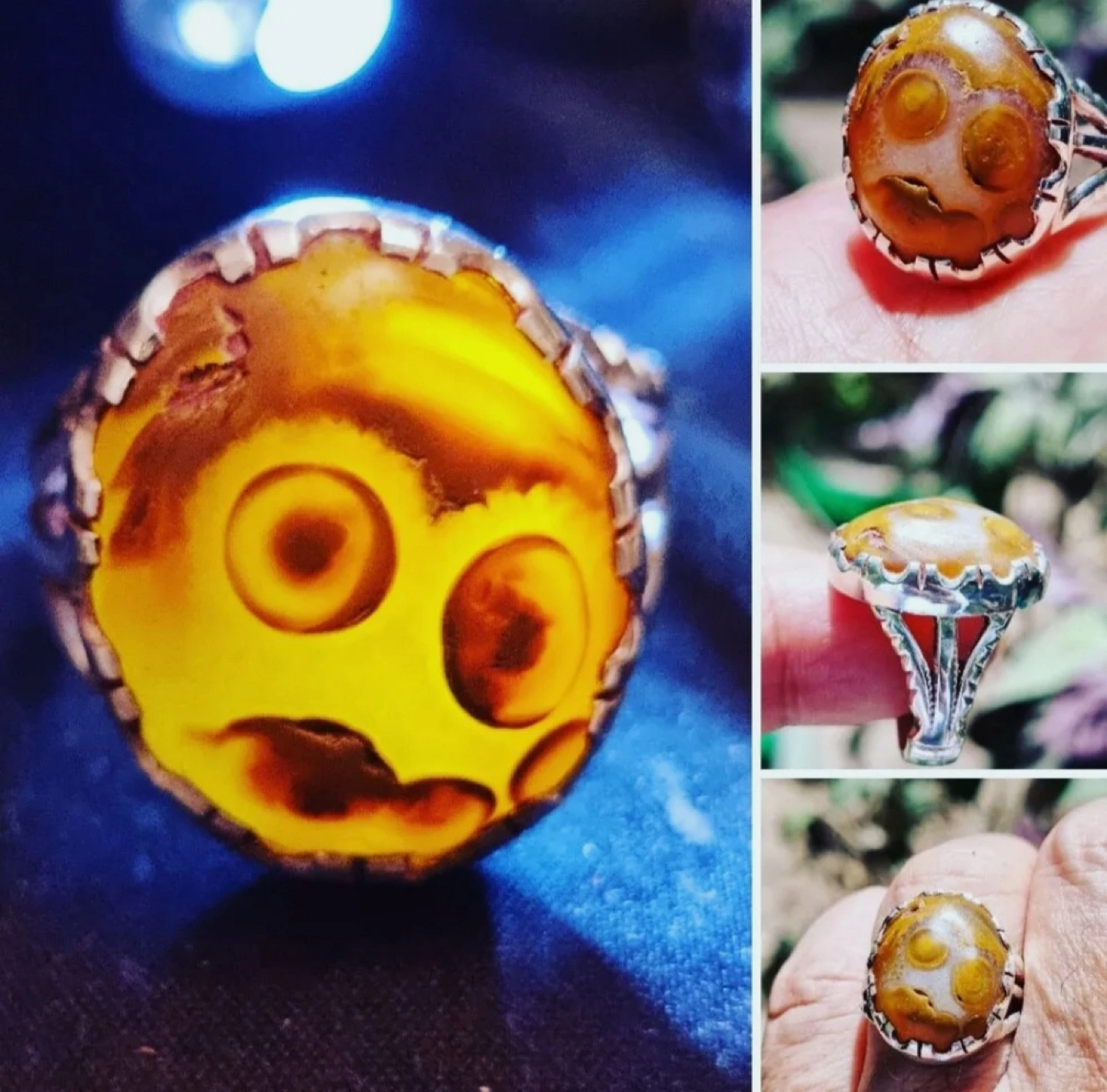 Selling a vintage silver ring with a unique brown stone. It has a distinctive design and is in good condition. It would be a great addition to any jewelry collection.