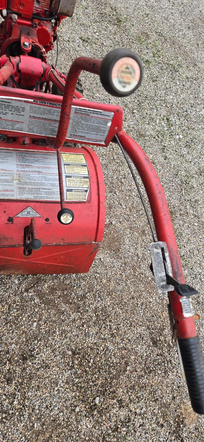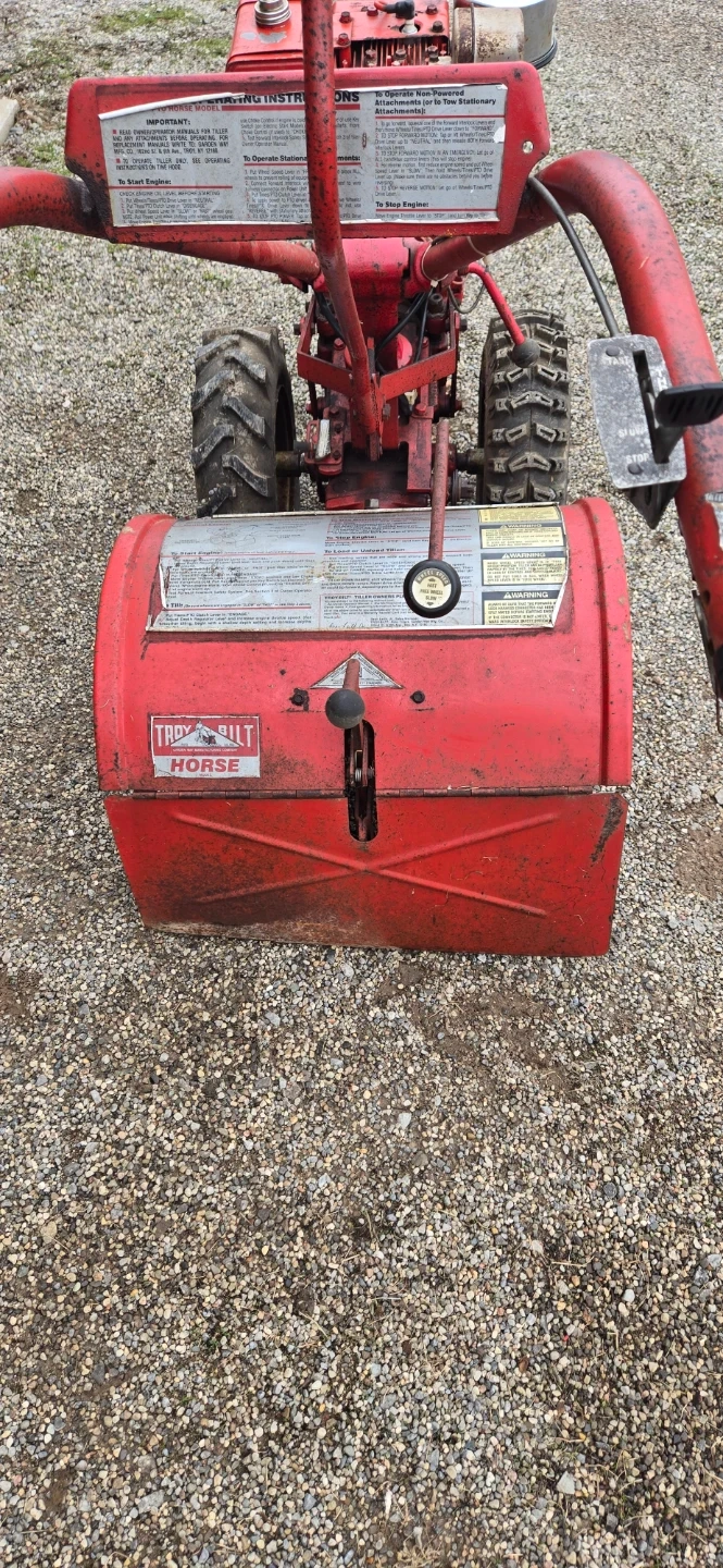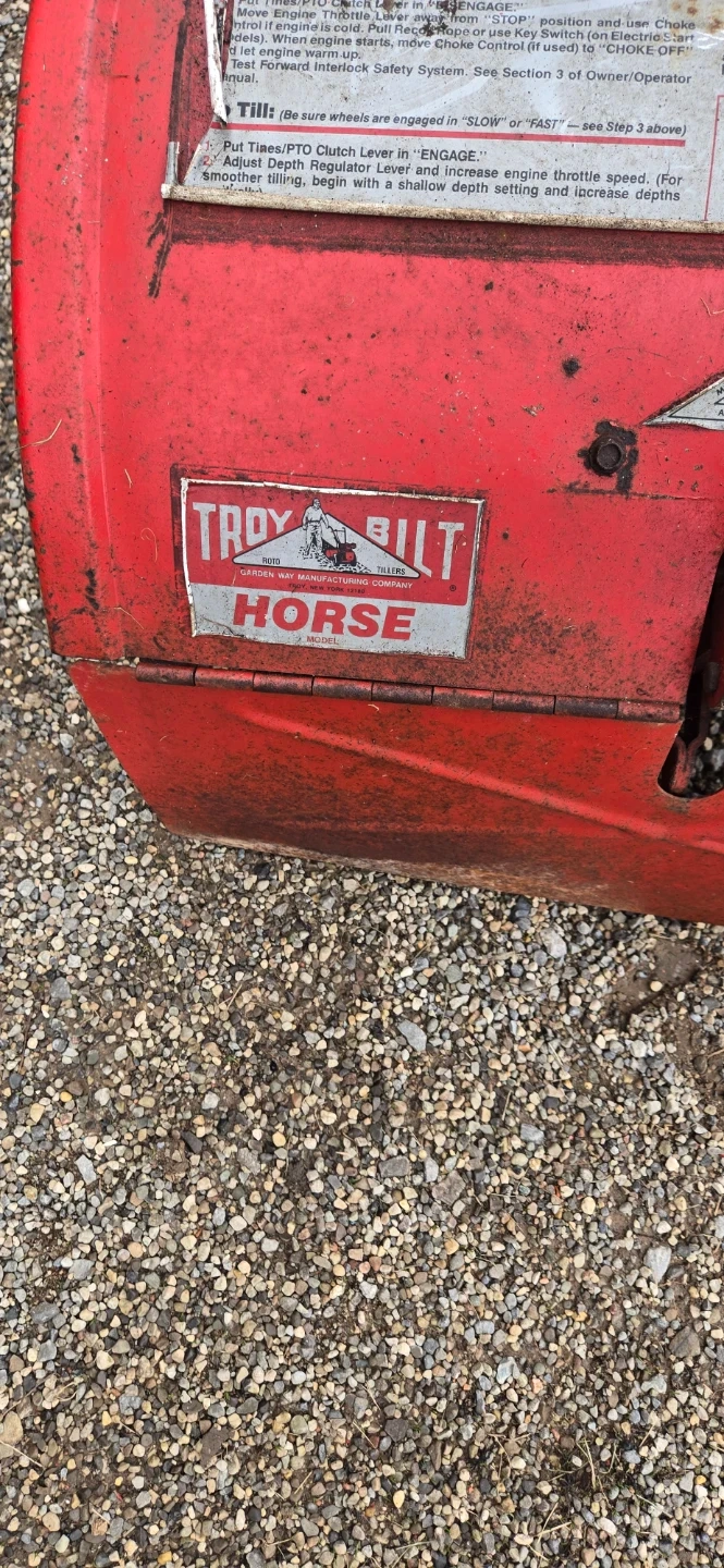 Powerful red Troy-Bilt Horse rear-tine tiller has 7HP gas motor.