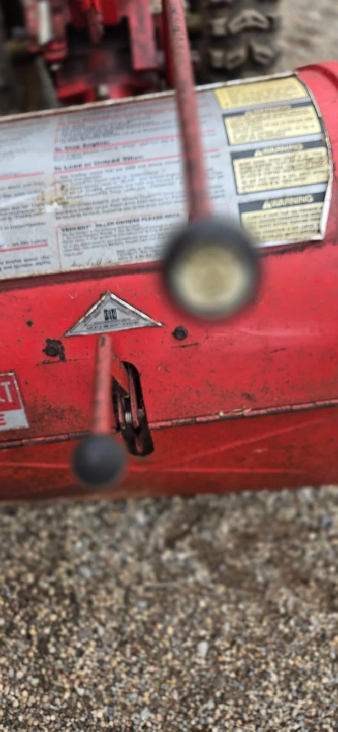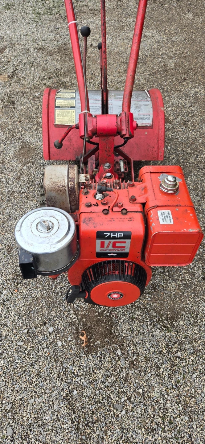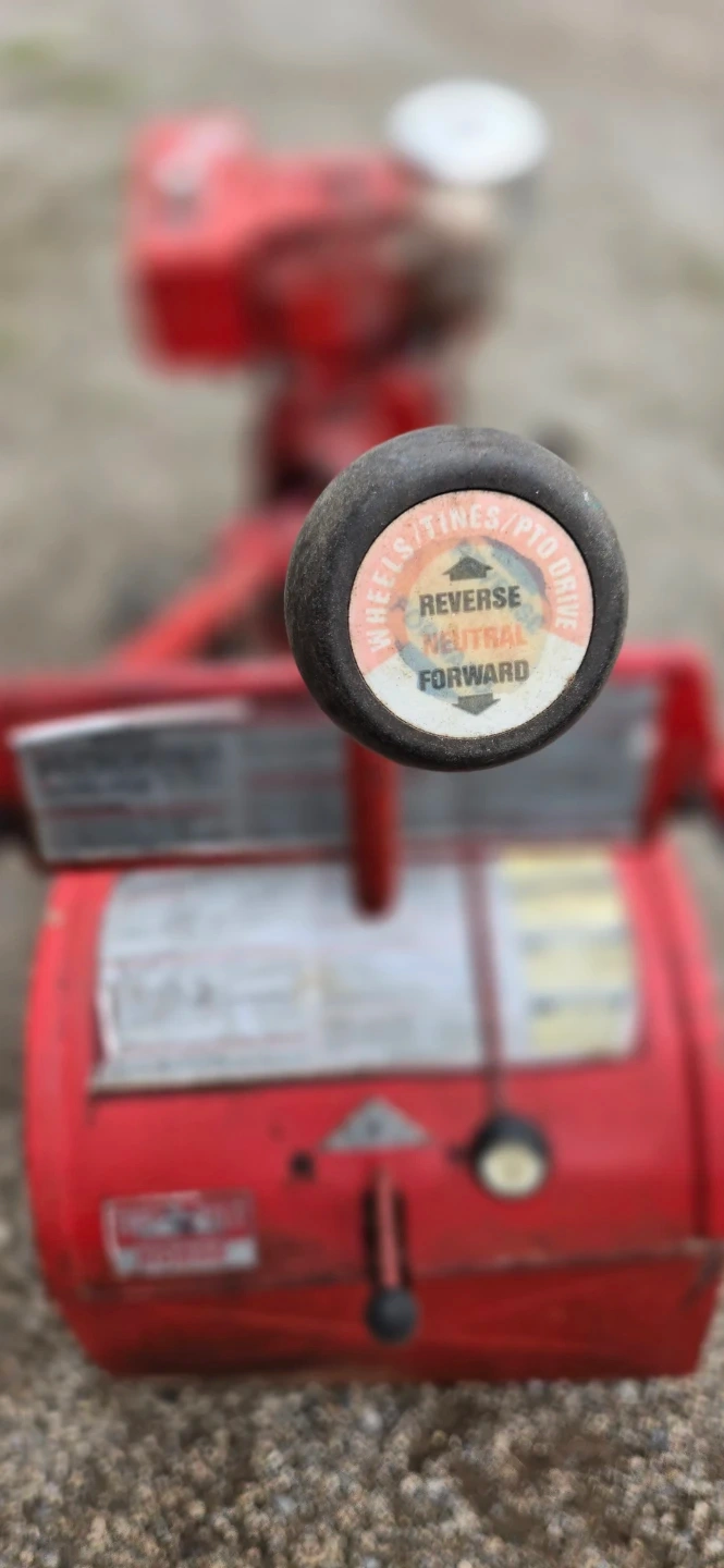 Industrial/Commercial engine. Metal construction with heavy-duty tines and large tractor-style tires.
