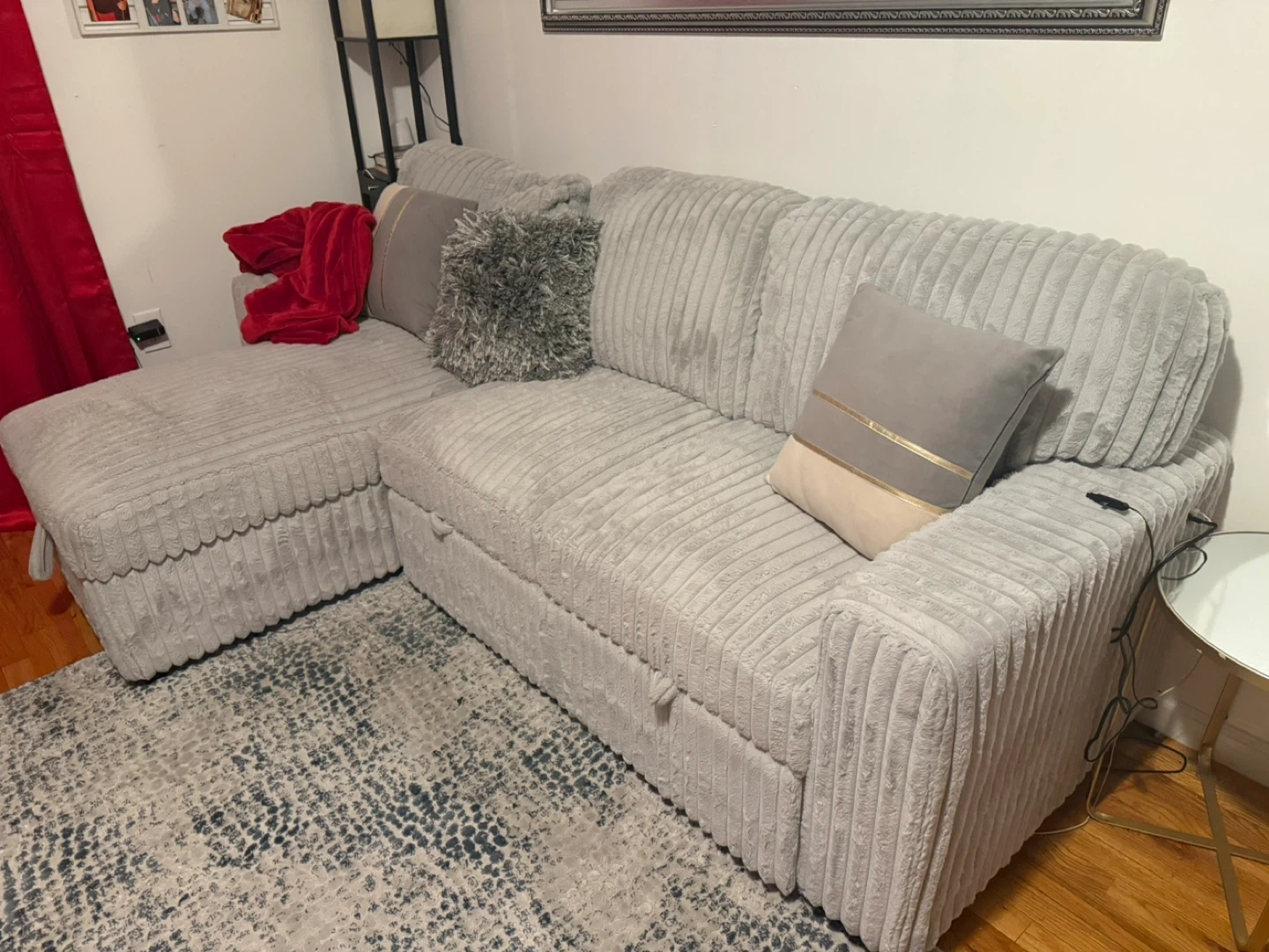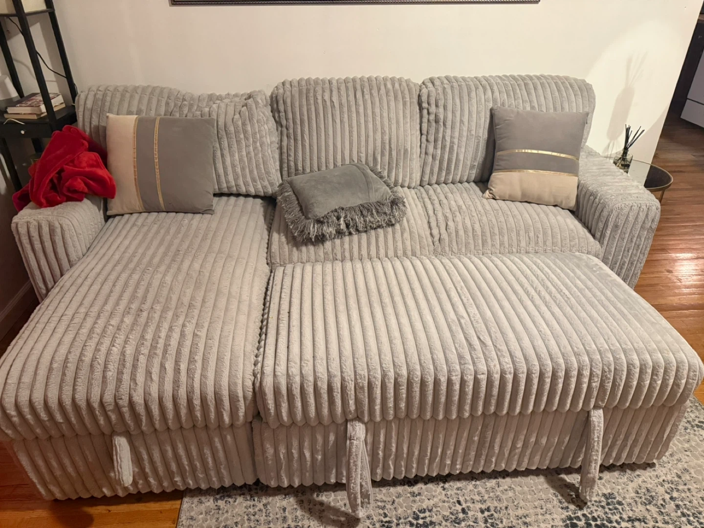This light gray sectional sofa features a soft corduroy fabric. It includes a pull-out bed and storage space within the chaise. Two decorative pillows are included. It's perfect for small spaces needing versatile seating and sleeping options!