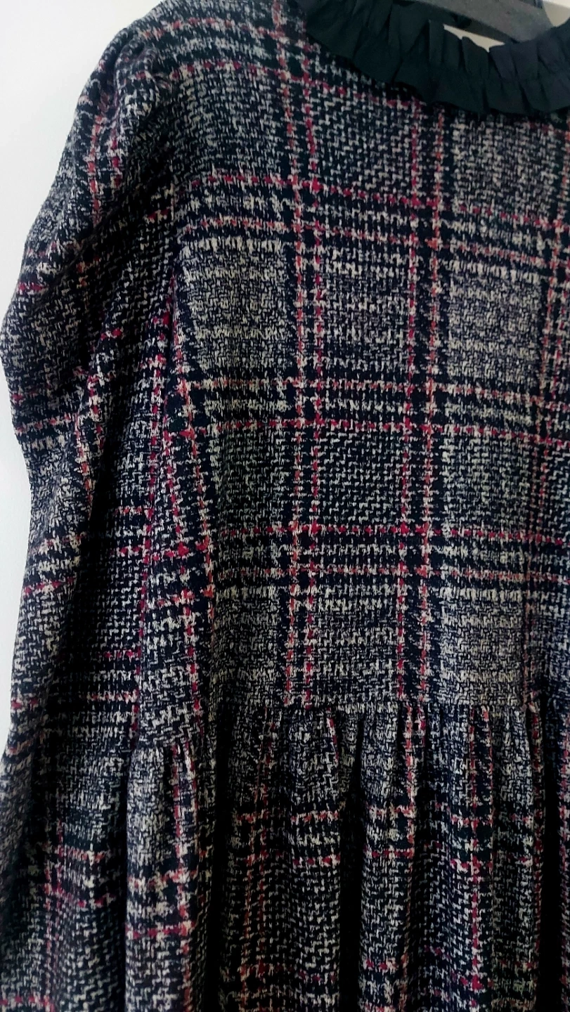 A women's long-sleeve dress featuring a classic plaid pattern. It has a ruffled collar and a gathered waistline. Made in Vietnam from a textured woven fabric.
