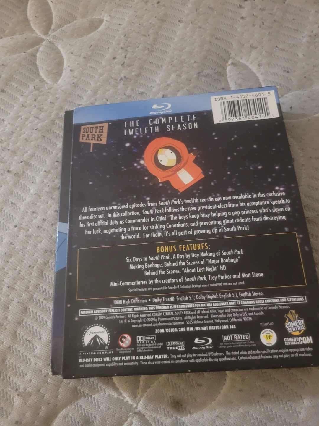All fourteen uncensored episodes from South Park's twelfth season are here on this three-disc Blu-ray set. It comes with bonus features including "Six Days to South Park," "A Day-by-Day Making of South Park," and "Major Boobage" behind-the-scenes. Mini-commentaries by creators Trey Parker and Matt Stone are also included. Dm me for location cash or etransfer only pick up only