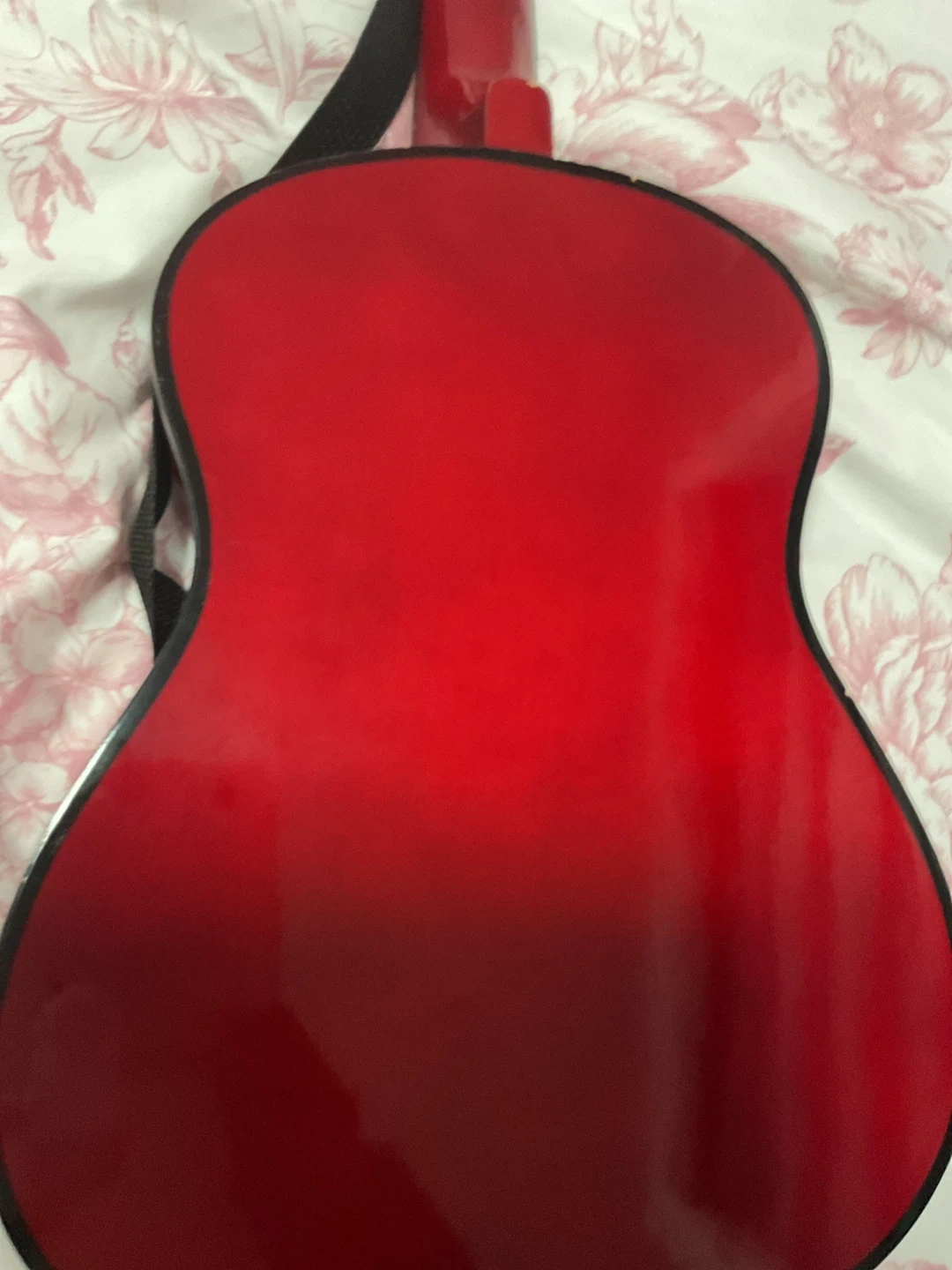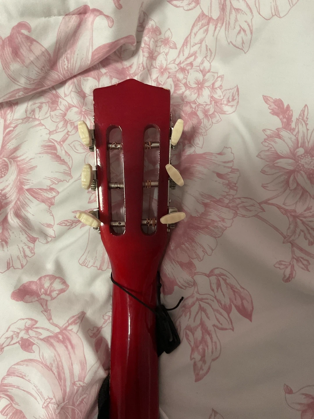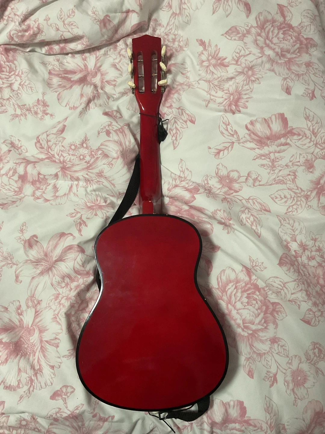 Selling a used 2/4 scale acoustic guitar. It features a red headstock and a beige body. It's in good condition and ready for a new home!