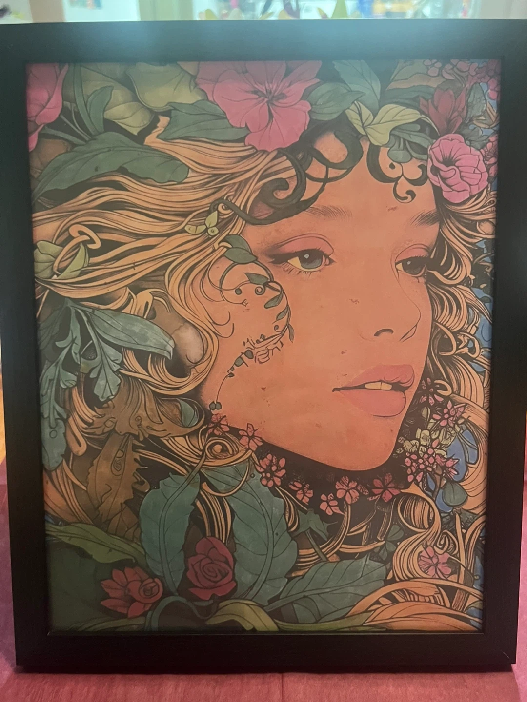 Framed art print featuring a woman adorned with flowers and foliage. It comes in a cute black frame with easel backing for display. You also get a copy of the original and all artwork is done by me. I can mail it to you for a little extra for postage and you can also come and pick it up and I am located in the beaches area of Toronto Message