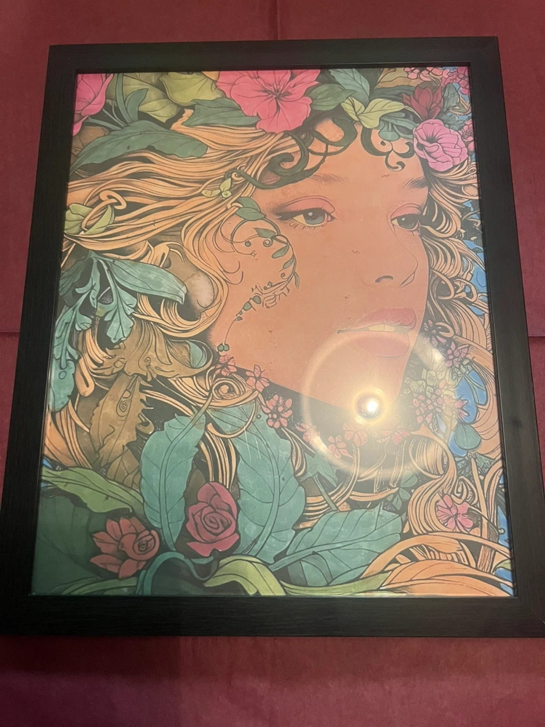 Framed art print featuring a woman adorned with flowers and foliage. It comes in a cute black frame with easel backing for display. You also get a copy of the original and all artwork is done by me. I can mail it to you for a little extra for postage and you can also come and pick it up and I am located in the beaches area of Toronto Message