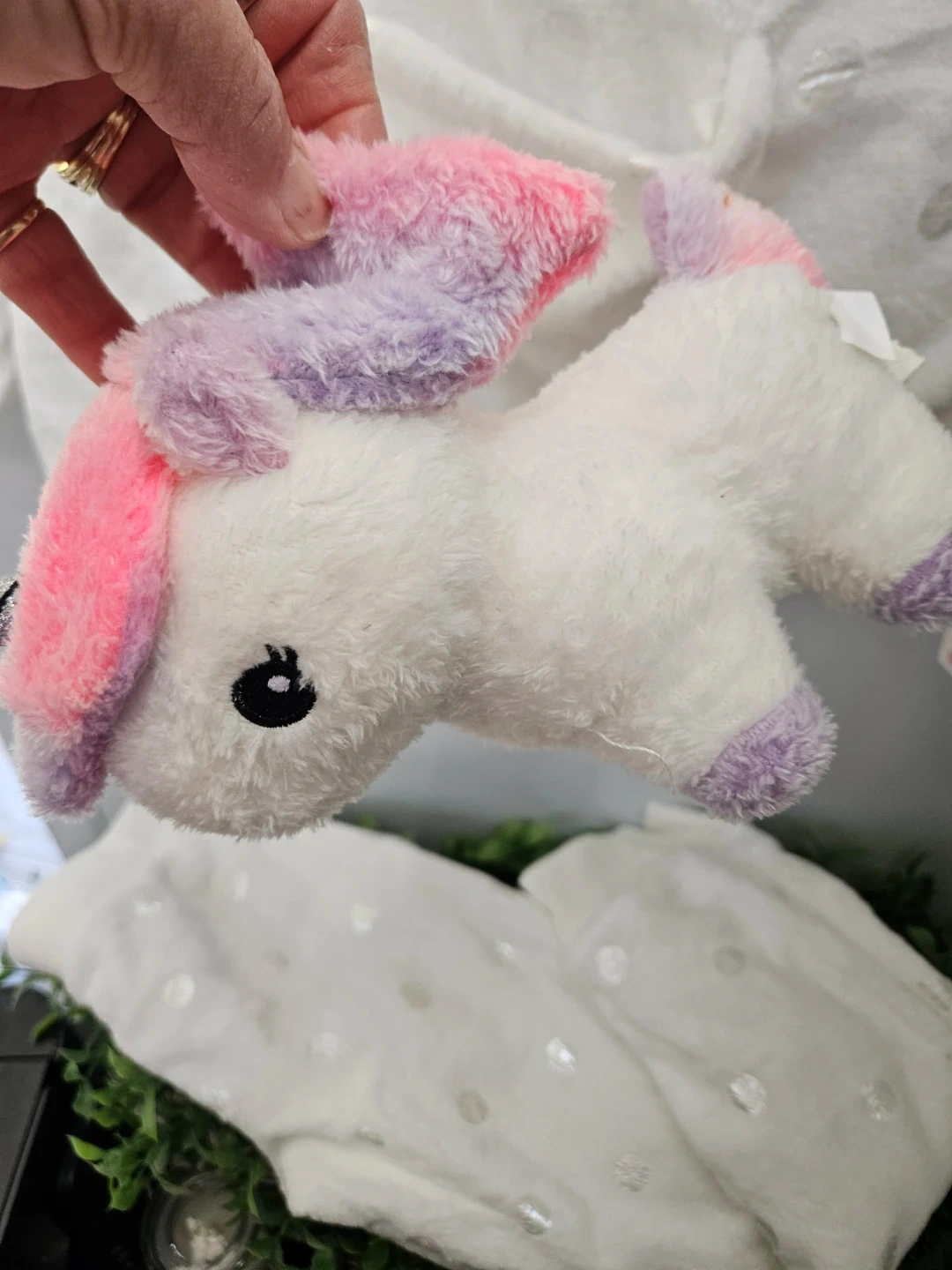 White plush unicorn pajama set with silver polka dots. Includes a small plush unicorn keychain attached to the pocket. Size is 5/6.