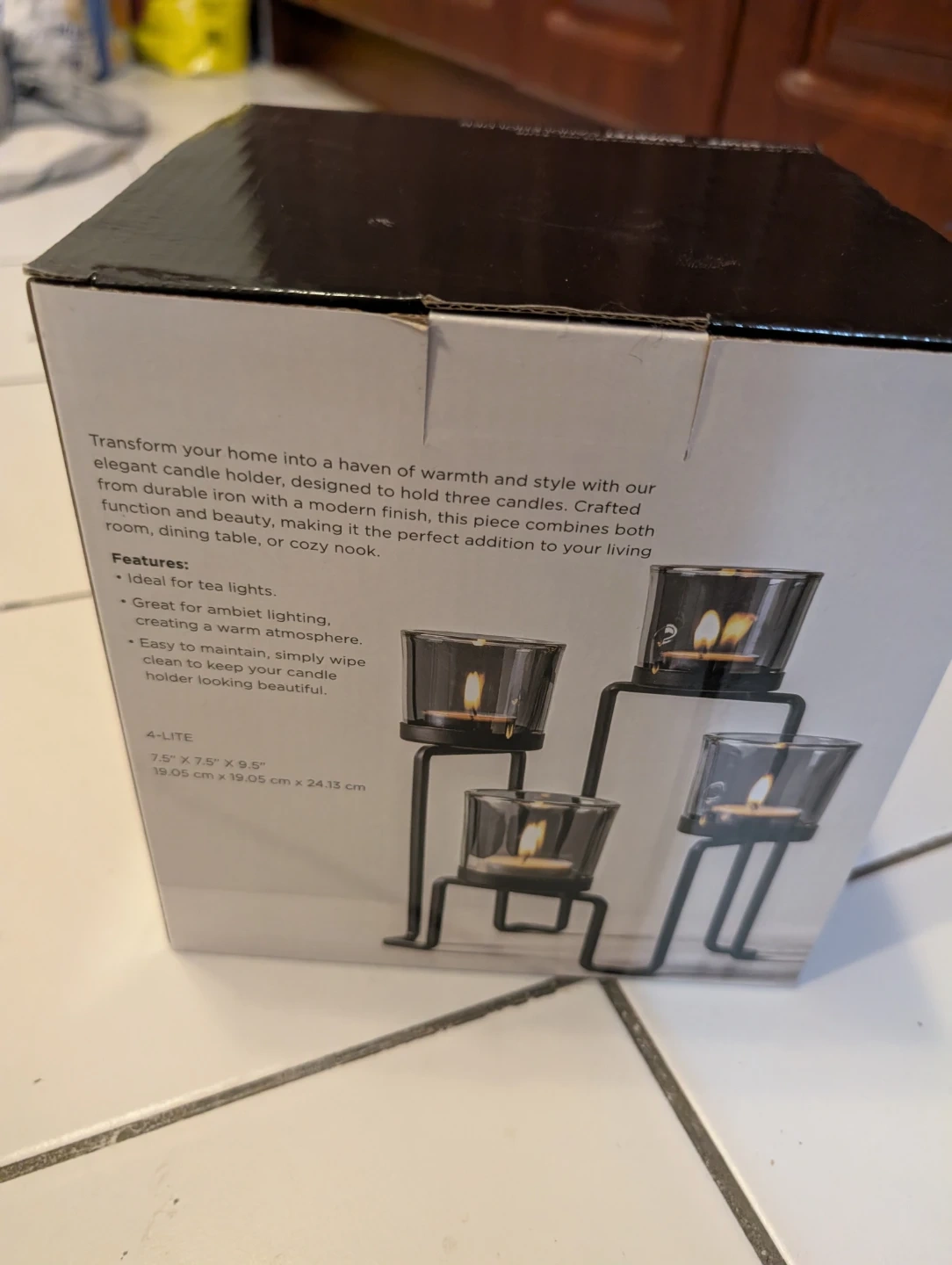 This HOMESTUFF quartet candleholder is designed to hold four tea lights. It's made of durable iron with a modern finish. Dimensions are 7.5" x 7.5" x 9.5" (19.05 cm x 19.05 cm x 24.13 cm).