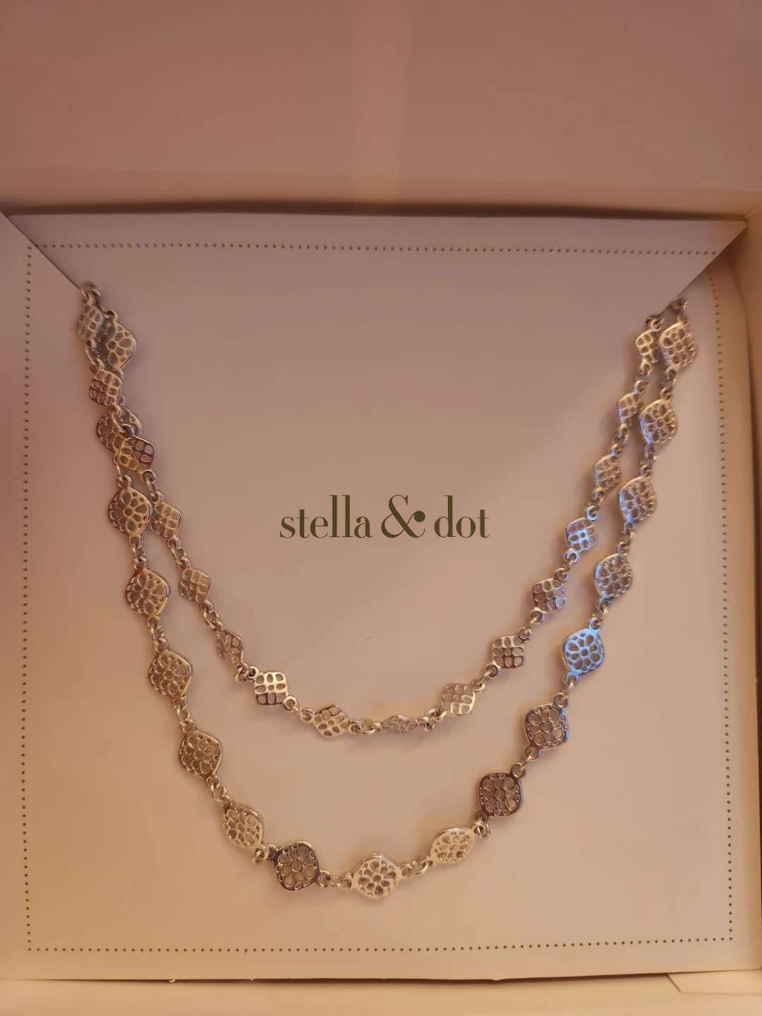This is a Stella & Dot necklace with a silver tone finish. It features a delicate chain with patterned links. Extra long to make a layered look. Exquisite!