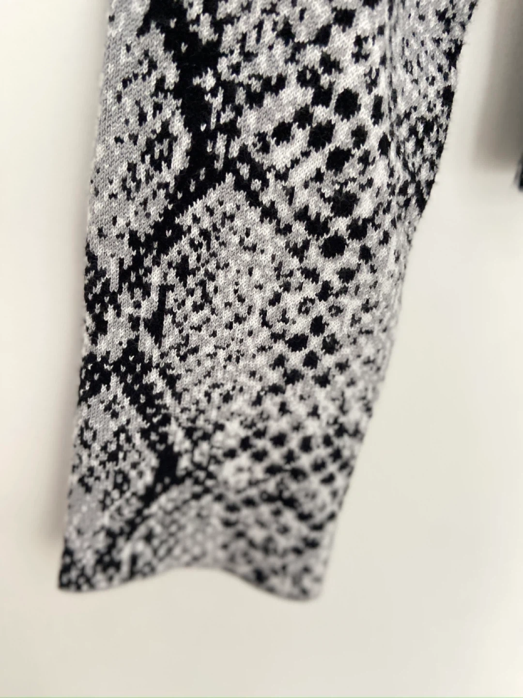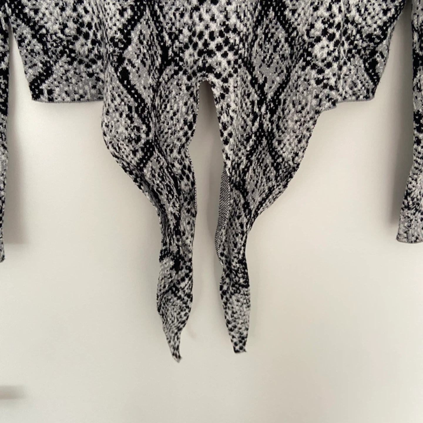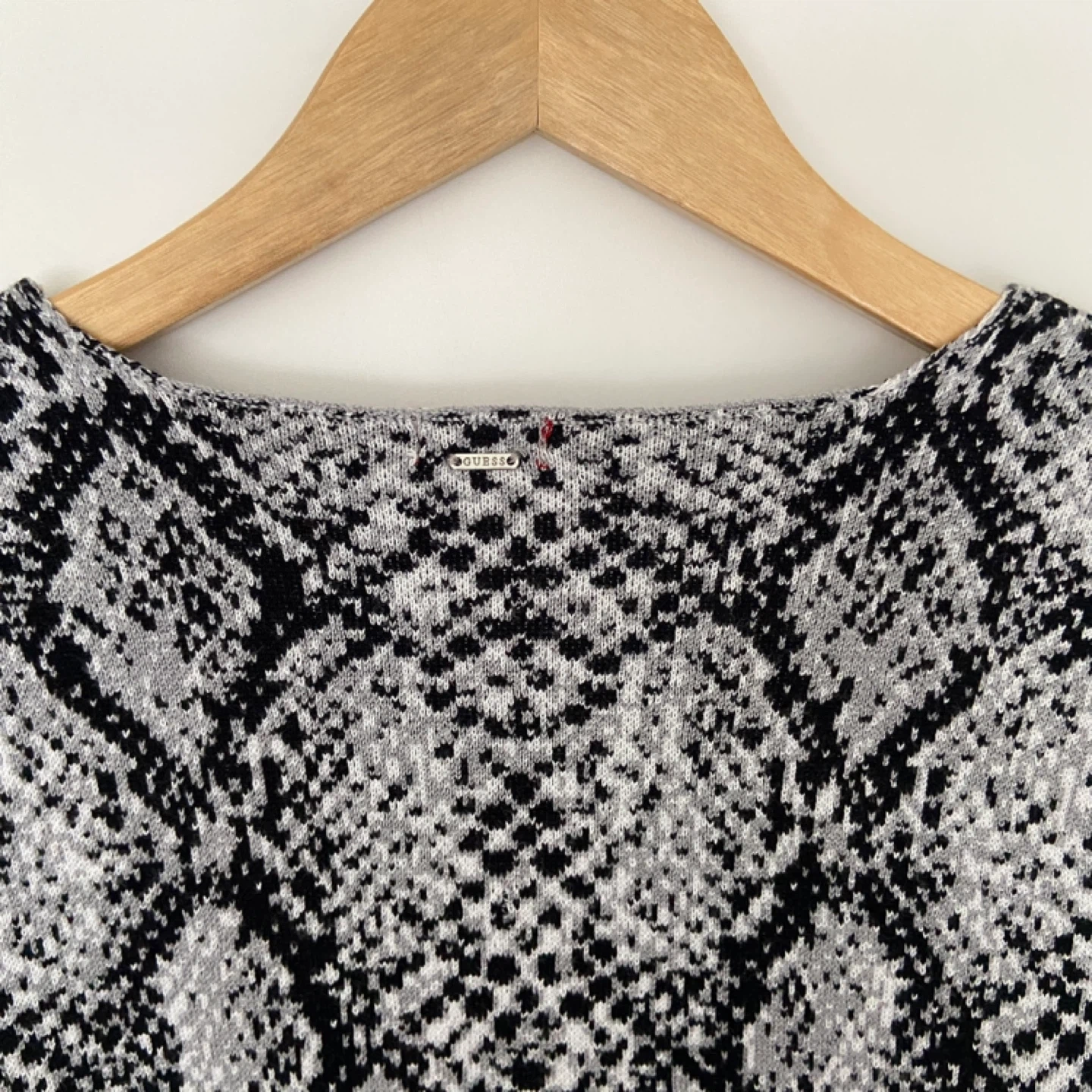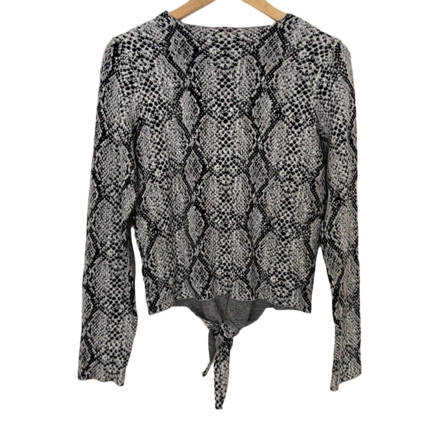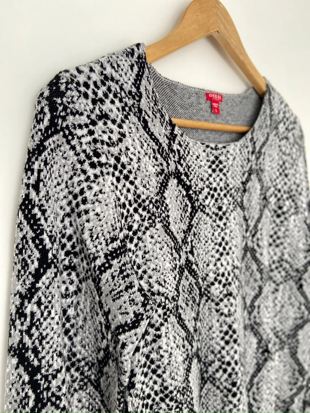 A stylish GUESS sweater featuring a black and grey snake print. It's designed with long sleeves and a tie-front detail. Made from a comfortable knit material.