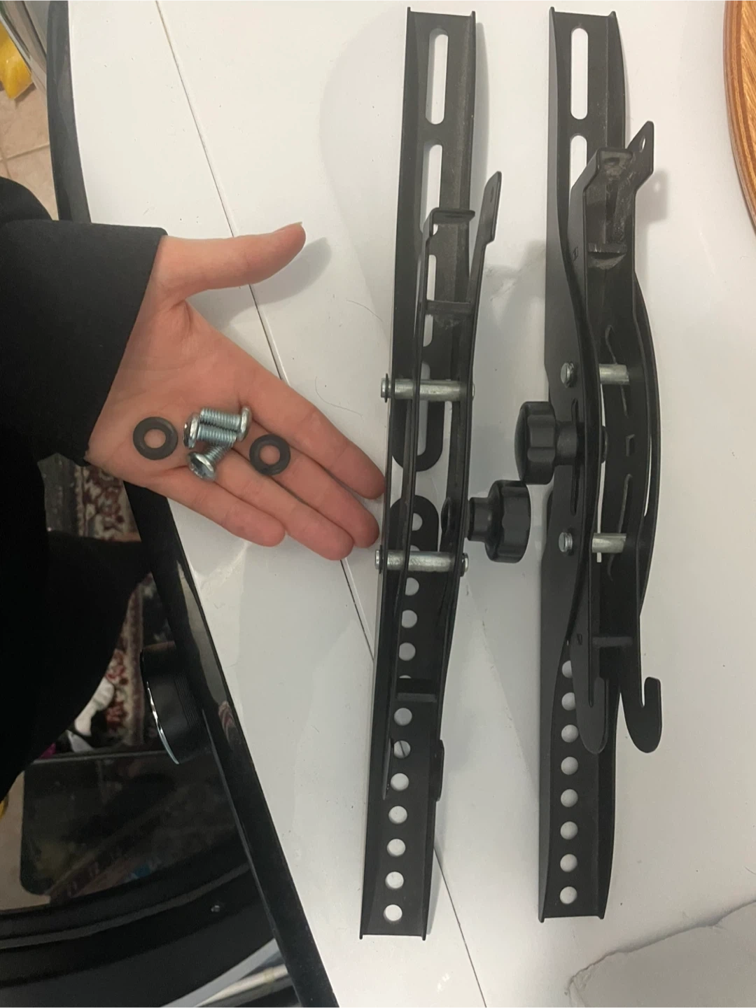 These are TV mount brackets. They are made of durable black metal. Comes with screws and washers for mounting. Perfect for setting up your television! Not sure what size this fits but it’s for a smaller tv