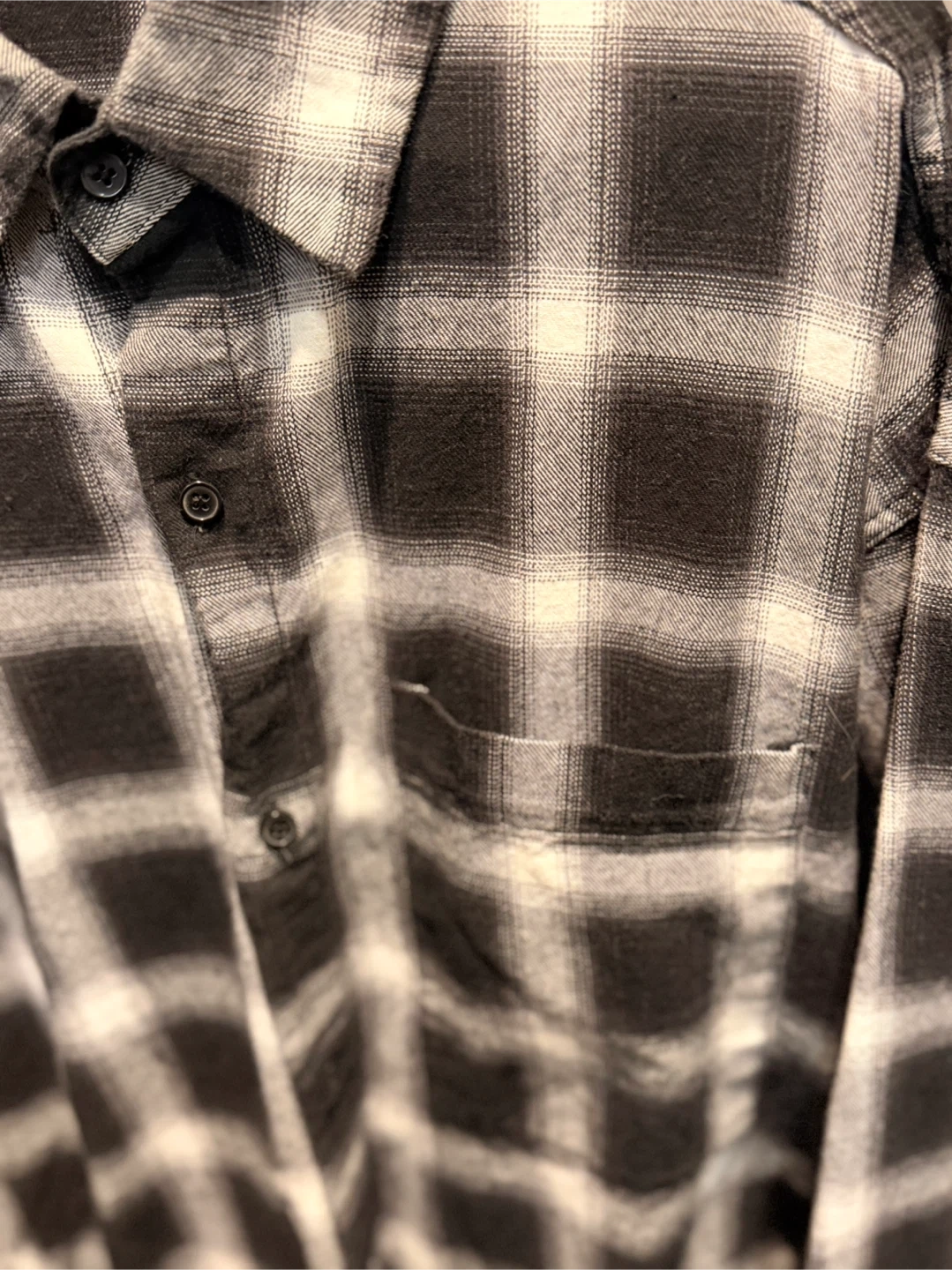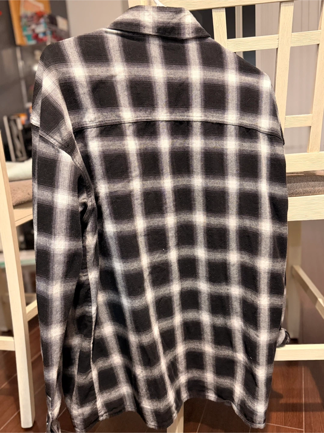 A classic black and white plaid flannel shirt from UNECE. It's a long-sleeved button-up style with a chest pocket. Soft and comfortable material. No dirty and scratches.