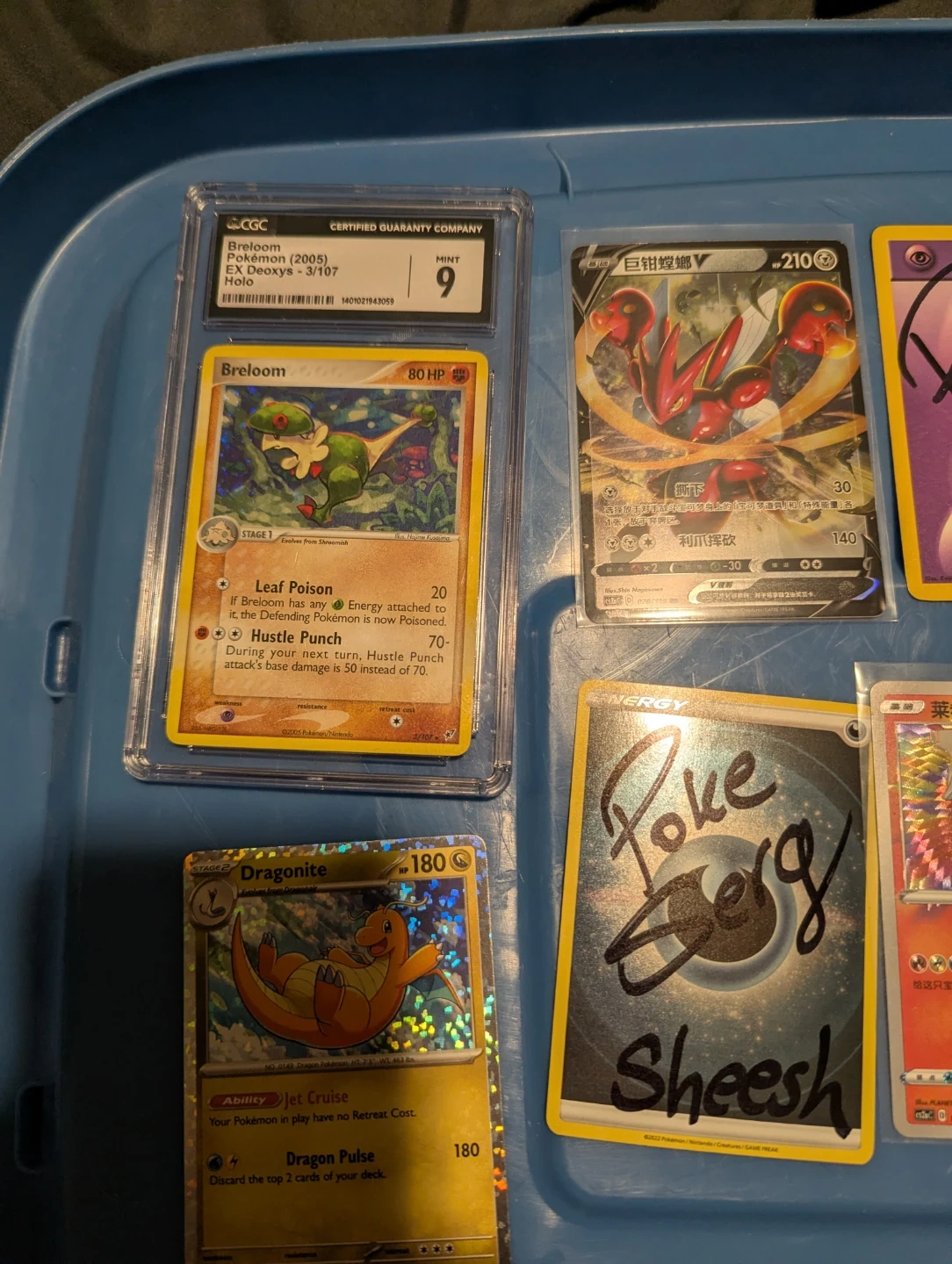 This is a CGC graded Breloom EX Deoxys Holo card. These are from a pokeserg Livestream where you buy the packs and he openes live H. Also have energy cards signed by Pokeserg Includes original grading case PSA mint (9)