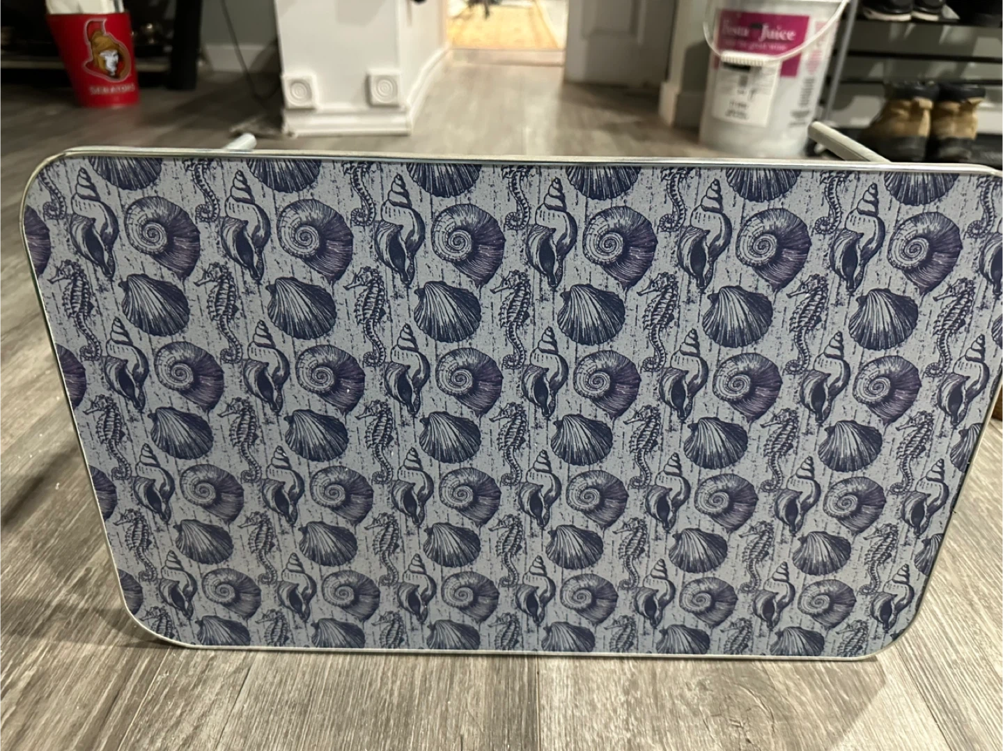 Selling a cute folding lap desk featuring a seashell pattern! It's perfect for working or snacking comfortably from your couch or bed. The legs fold easily for convenient storage