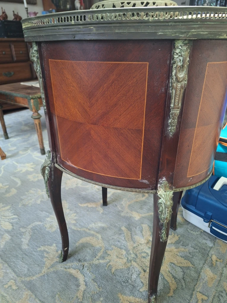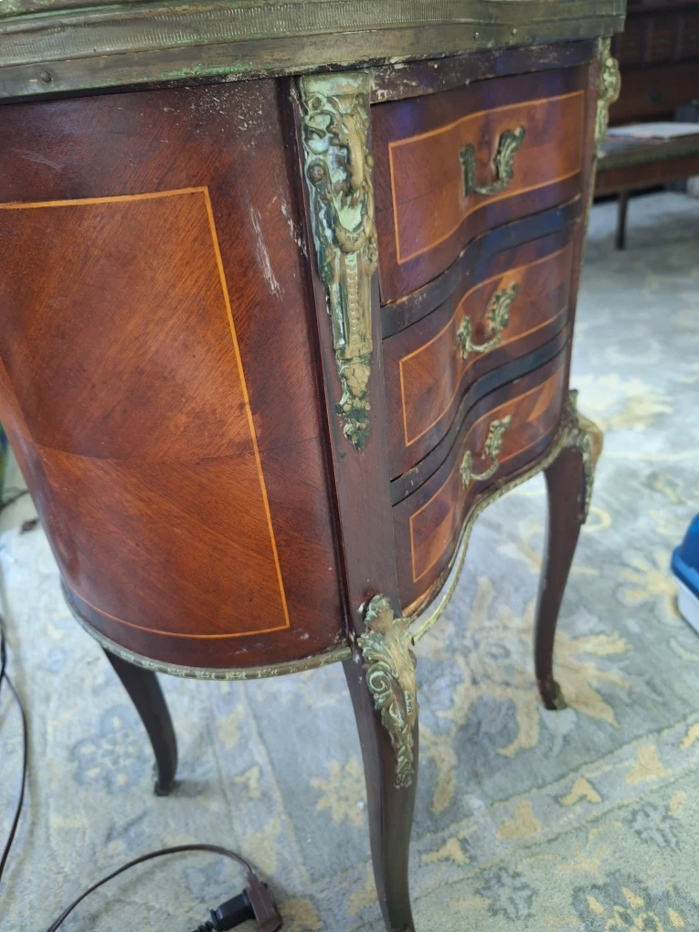 Selling a charming vintage-style wood side table. It features a beautiful wood grain finish, three drawers, and ornate metal accents. A lovely addition to any room!
